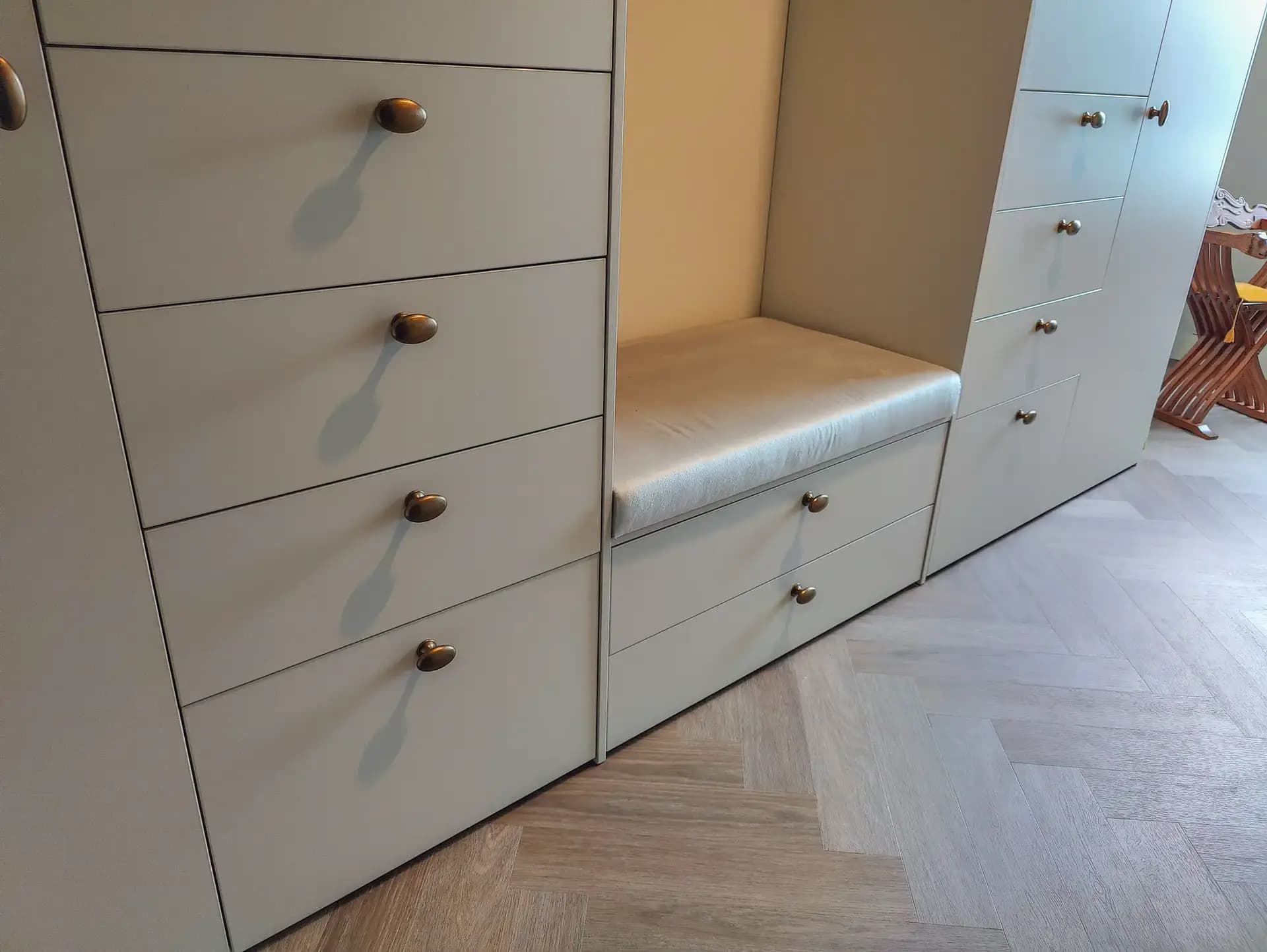 Deze klassieke, chique inloopkast in Barneveld is een toonbeeld van maatwerk en elegantie. Vervaardigd uit hoogwaardige meubelplaat, biedt deze op maat gemaakte inloopkast niet alleen veel opbergruimte, maar ook een verfijnde uitstraling die perfect past bij de klassieke stijl van de woning. Een uniek kenmerk van deze kast is het ingebouwde zitje met een comfortabel kussen, dat een praktische en stijlvolle onderbreking vormt van de opbergruimte.