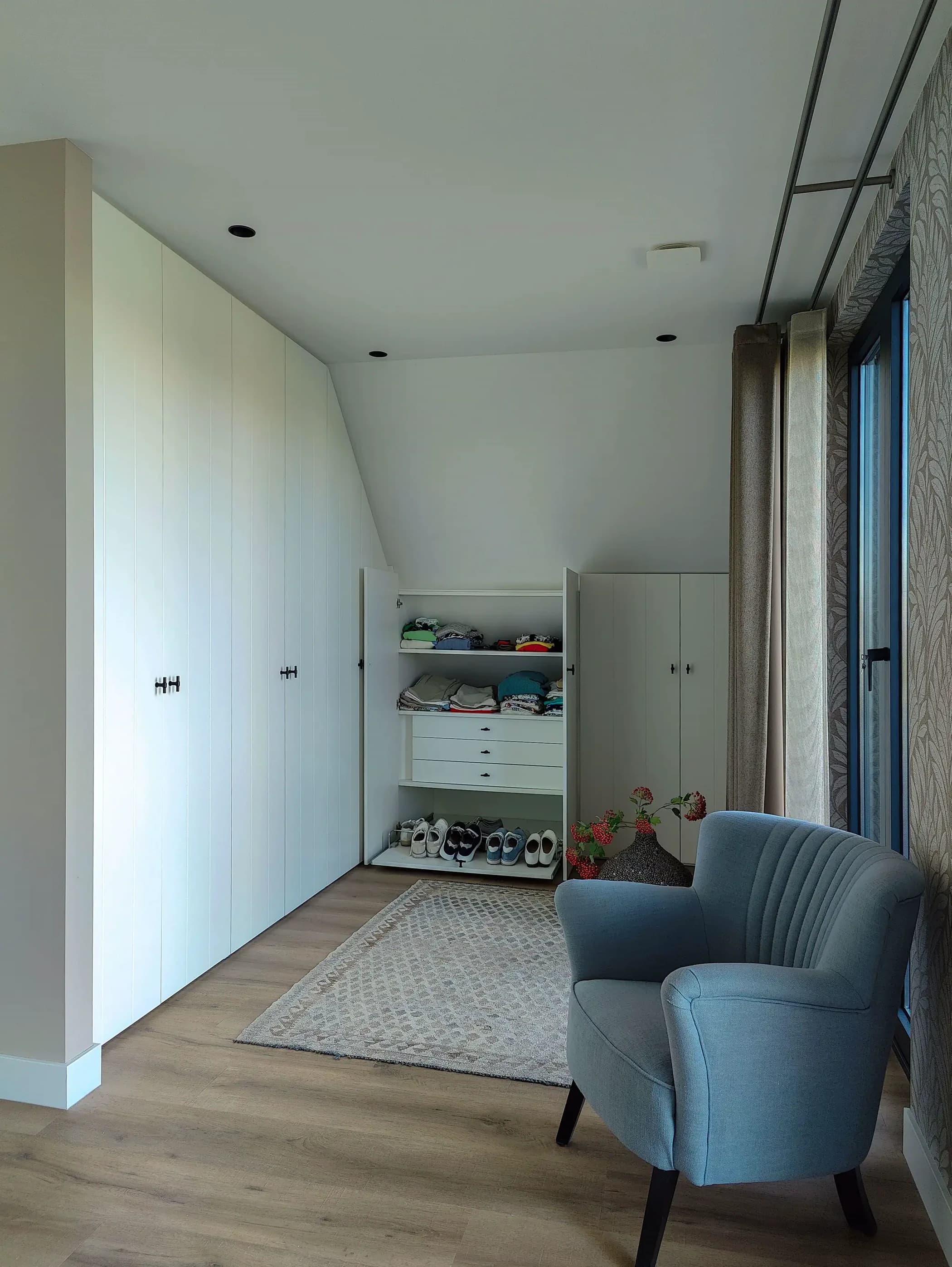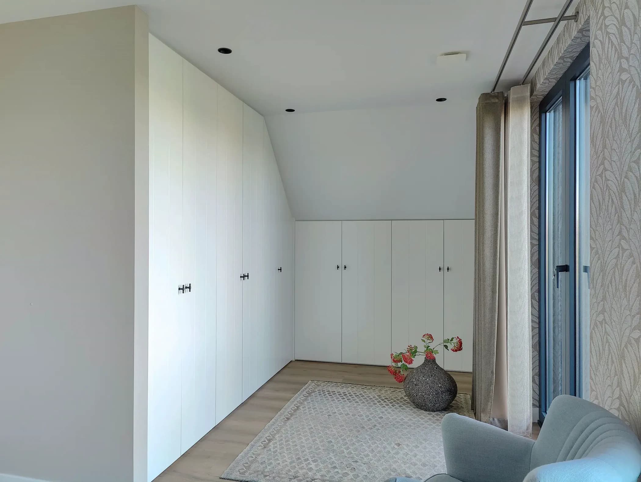 Landelijk witte kledingkast in L-vorm onder de schuine kap