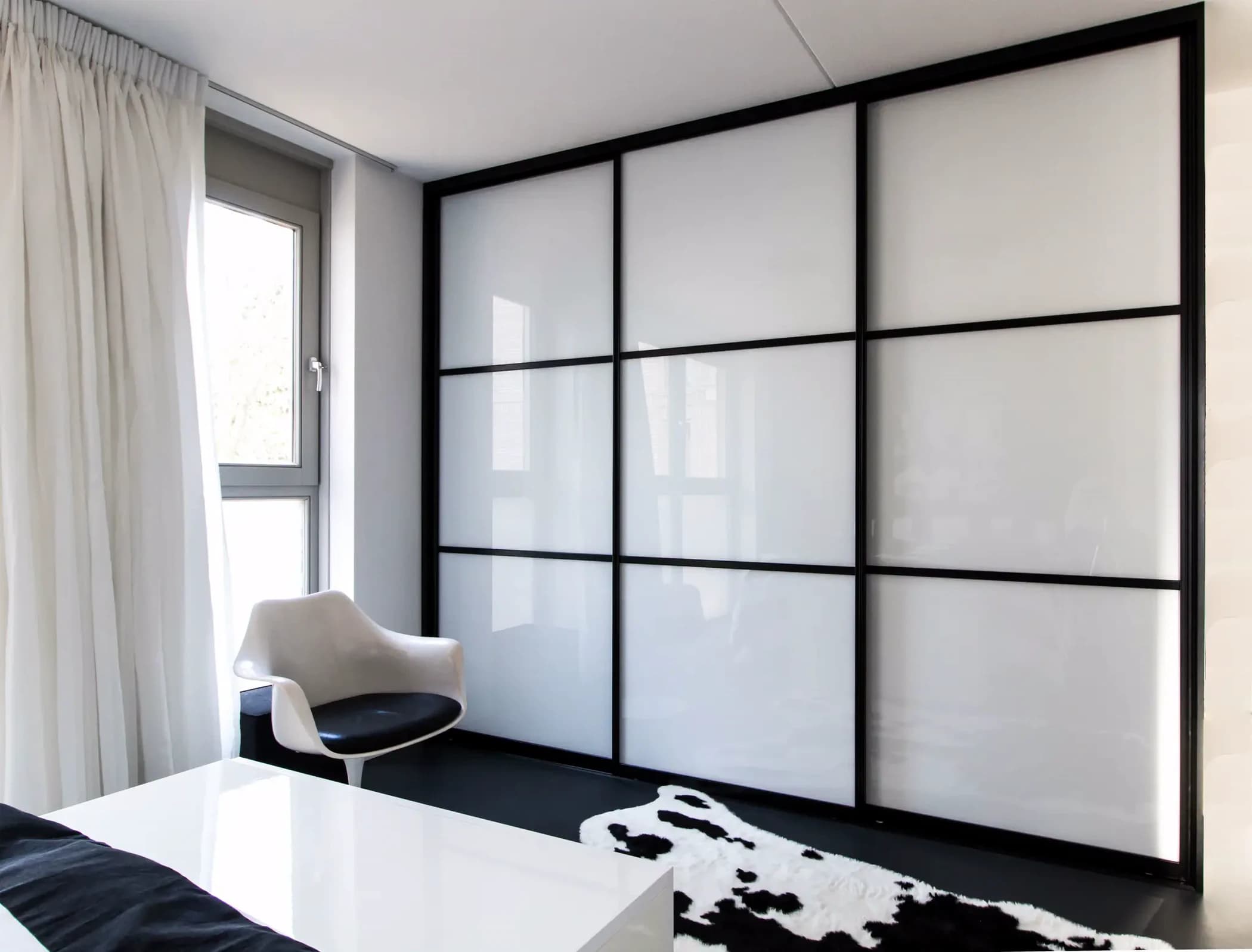 Schuifdeurkast, afgewerkt met melkglas en zwarte aluminiumprofielen