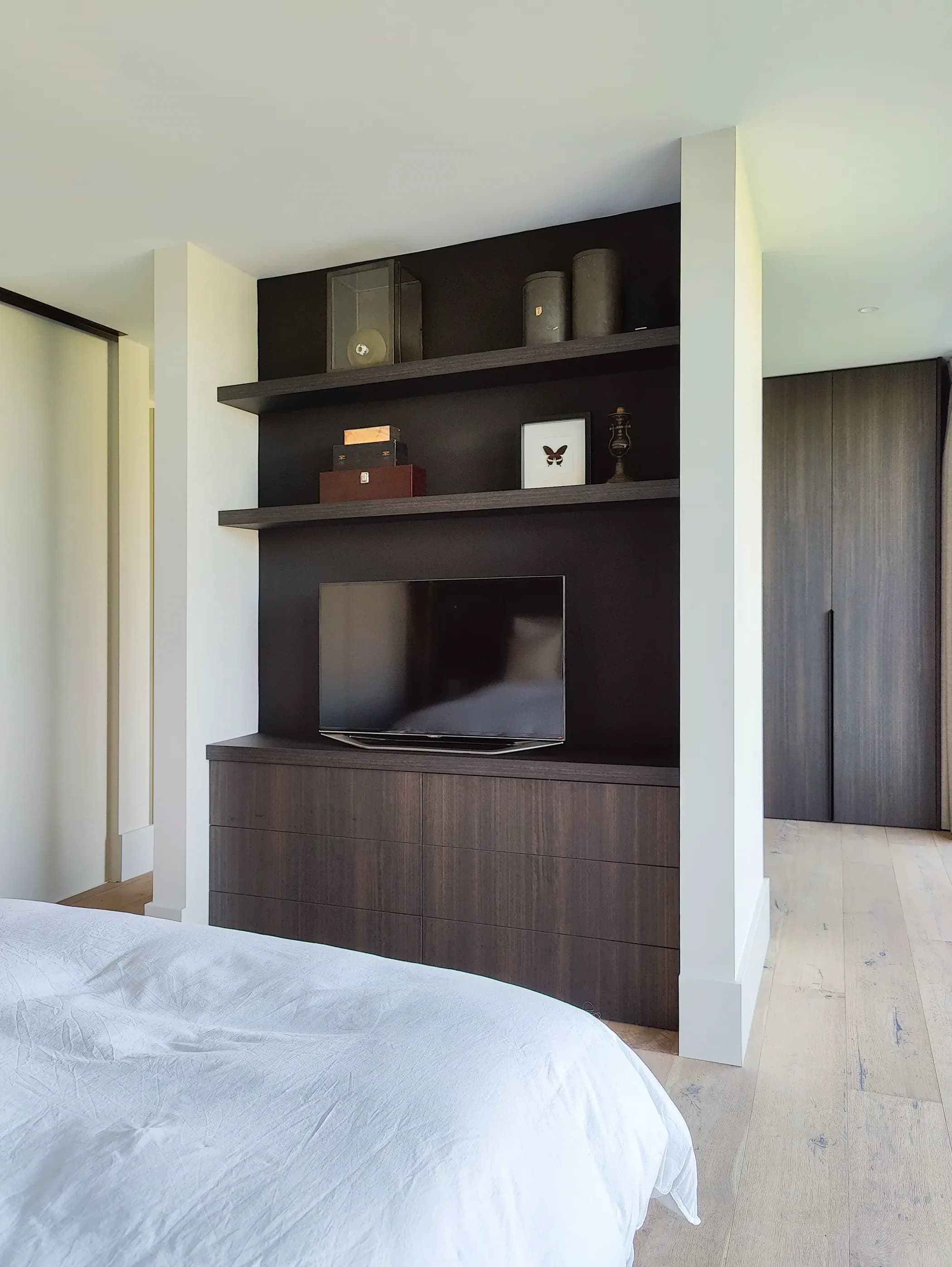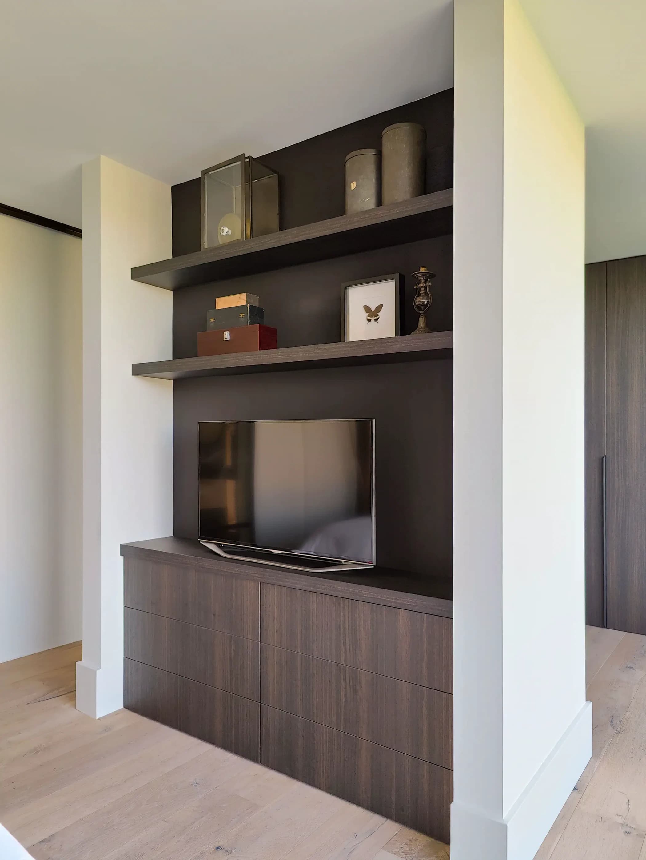 Deze roomdivider kast met tv-nis combineert functionaliteit en design. De nis biedt ruimte voor een televisie en decoratieve elementen, terwijl de gesloten lades zorgen voor een opgeruimd geheel. Dankzij het slimme ontwerp blijft de slaapkamer ruimtelijk ogen, terwijl de kast een duidelijke scheiding vormt tussen het slaapgedeelte en de rest van de ruimte.