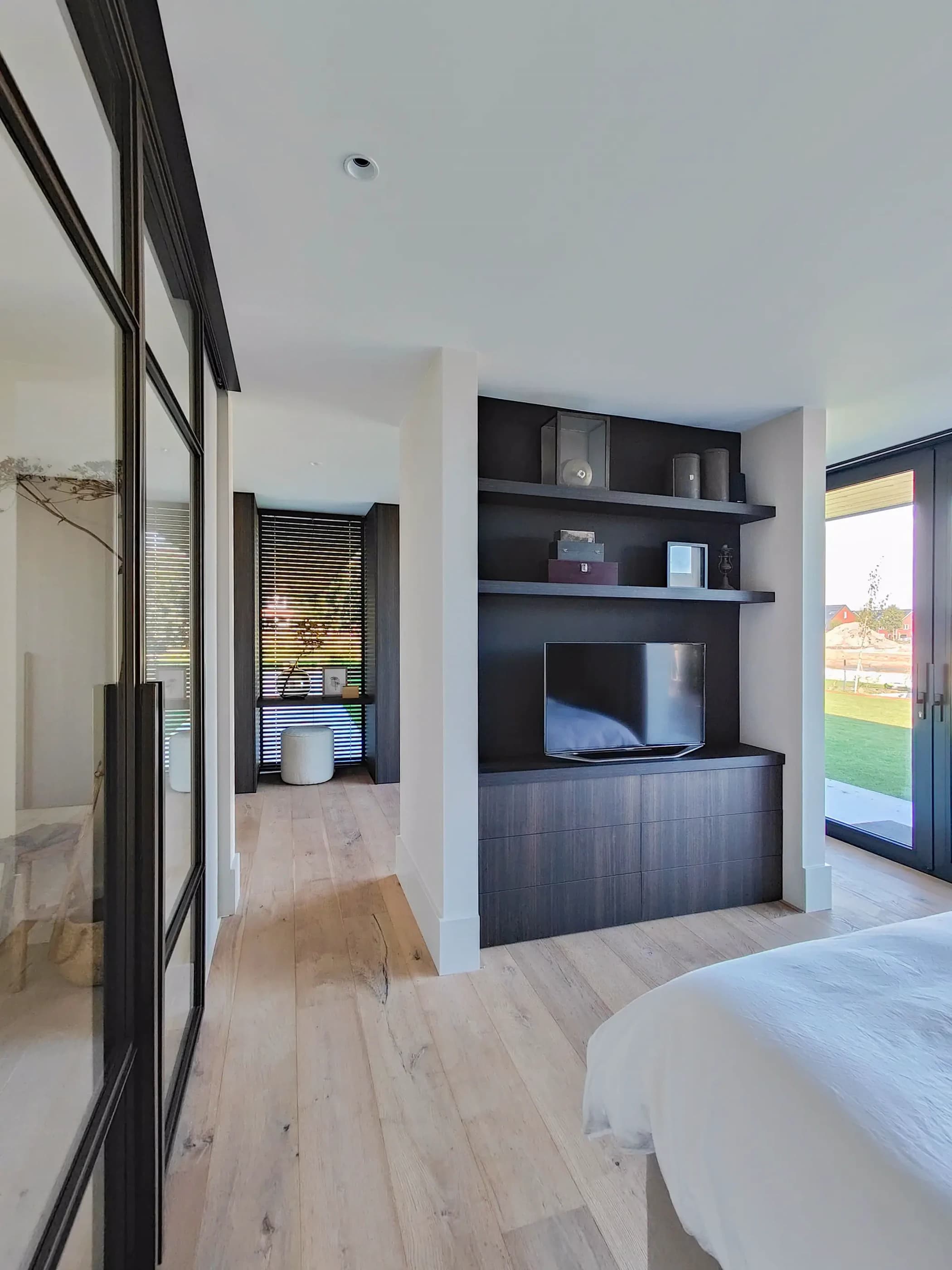 Een roomdivider kast is de perfecte oplossing om een ruimte praktisch in te delen zonder in te leveren op stijl. In deze moderne slaapkamer in Veenendaal is een maatwerk kast geplaatst die zowel functioneert als scheiding tussen het slaapgedeelte en de rest van de ruimte, als opbergruimte. De kast is afgewerkt in LR29 Sable Decolegno, een luxe donkere houtlook die warmte en diepte toevoegt aan het interieur. Dankzij het op maat gemaakte ontwerp sluit de kast naadloos aan op de ruimte, waardoor een strak en harmonieus geheel ontstaat.
