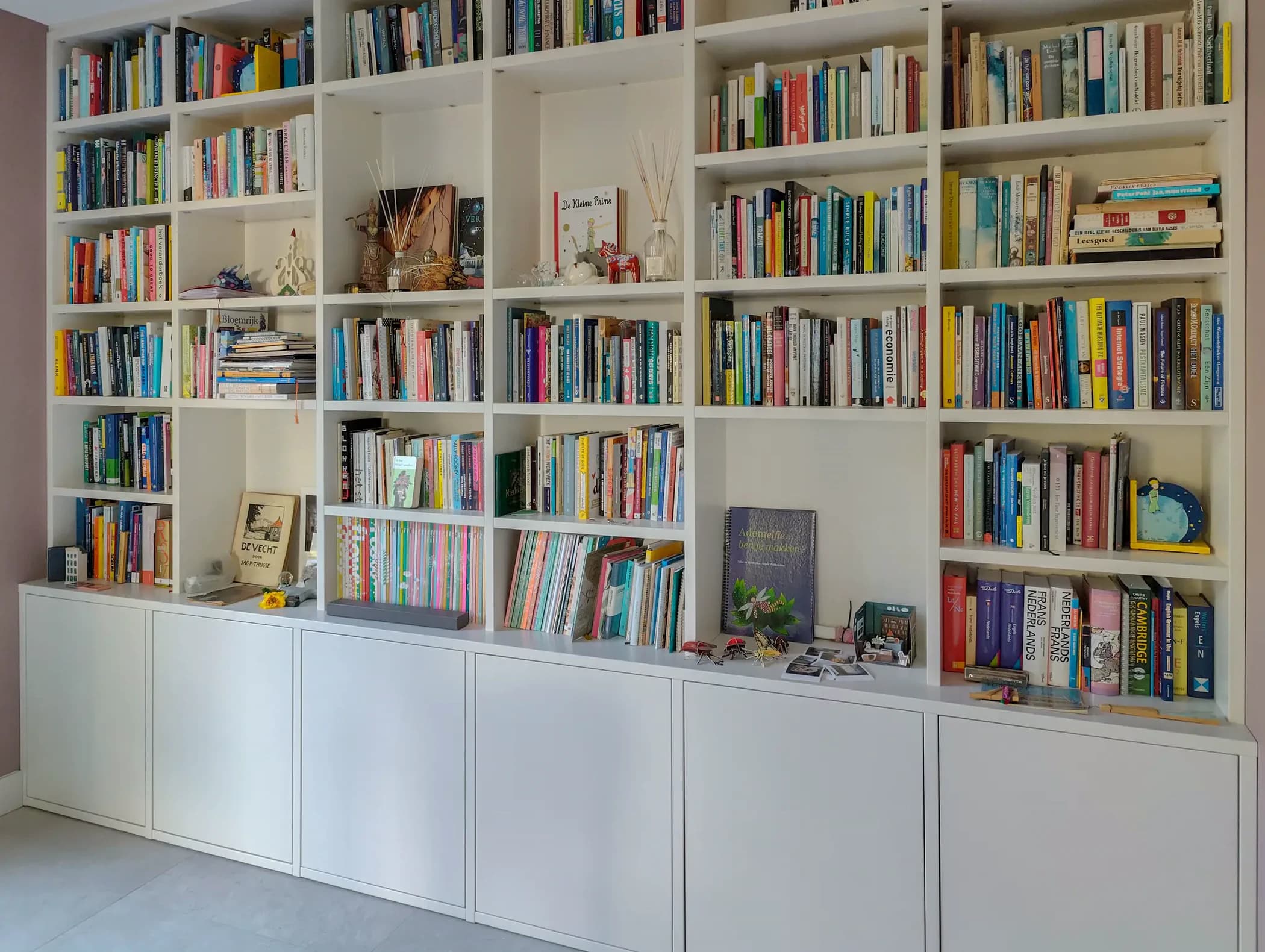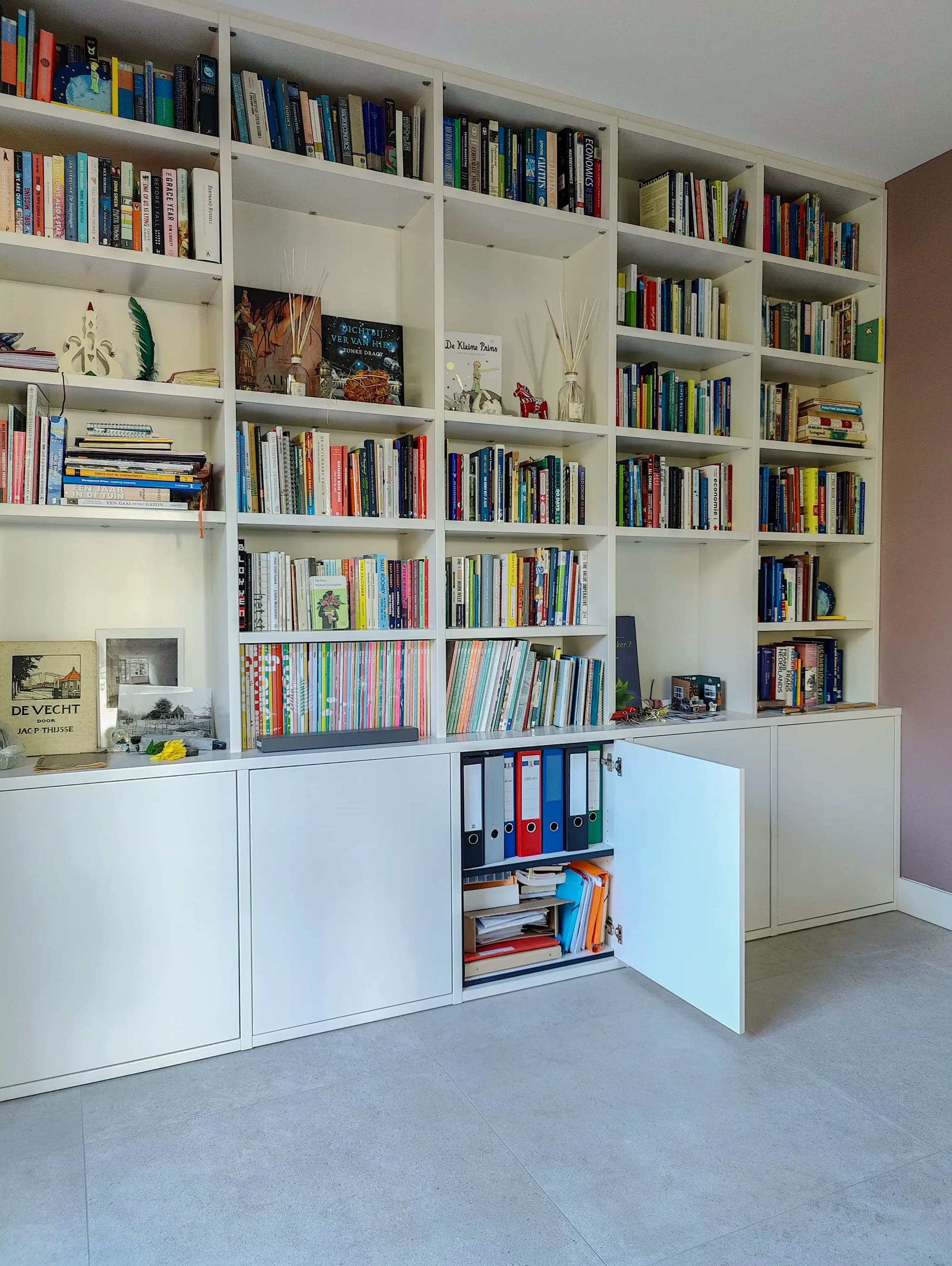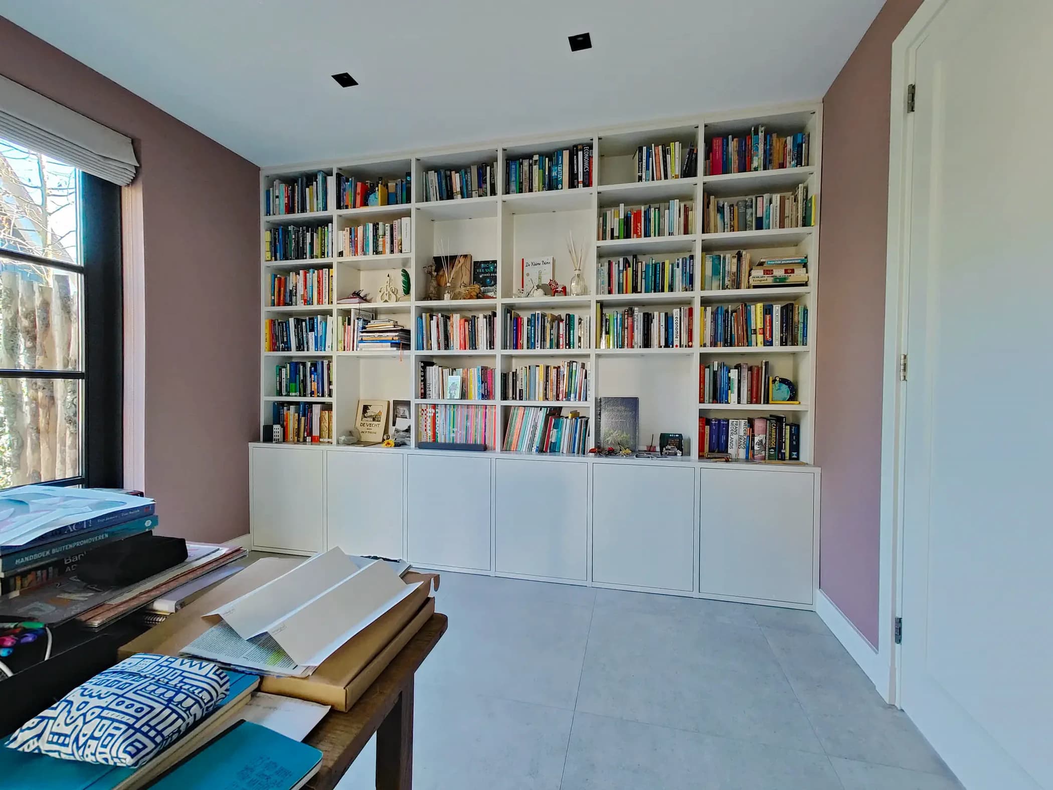Wandvullende boekenkast met dichte onderkastjes