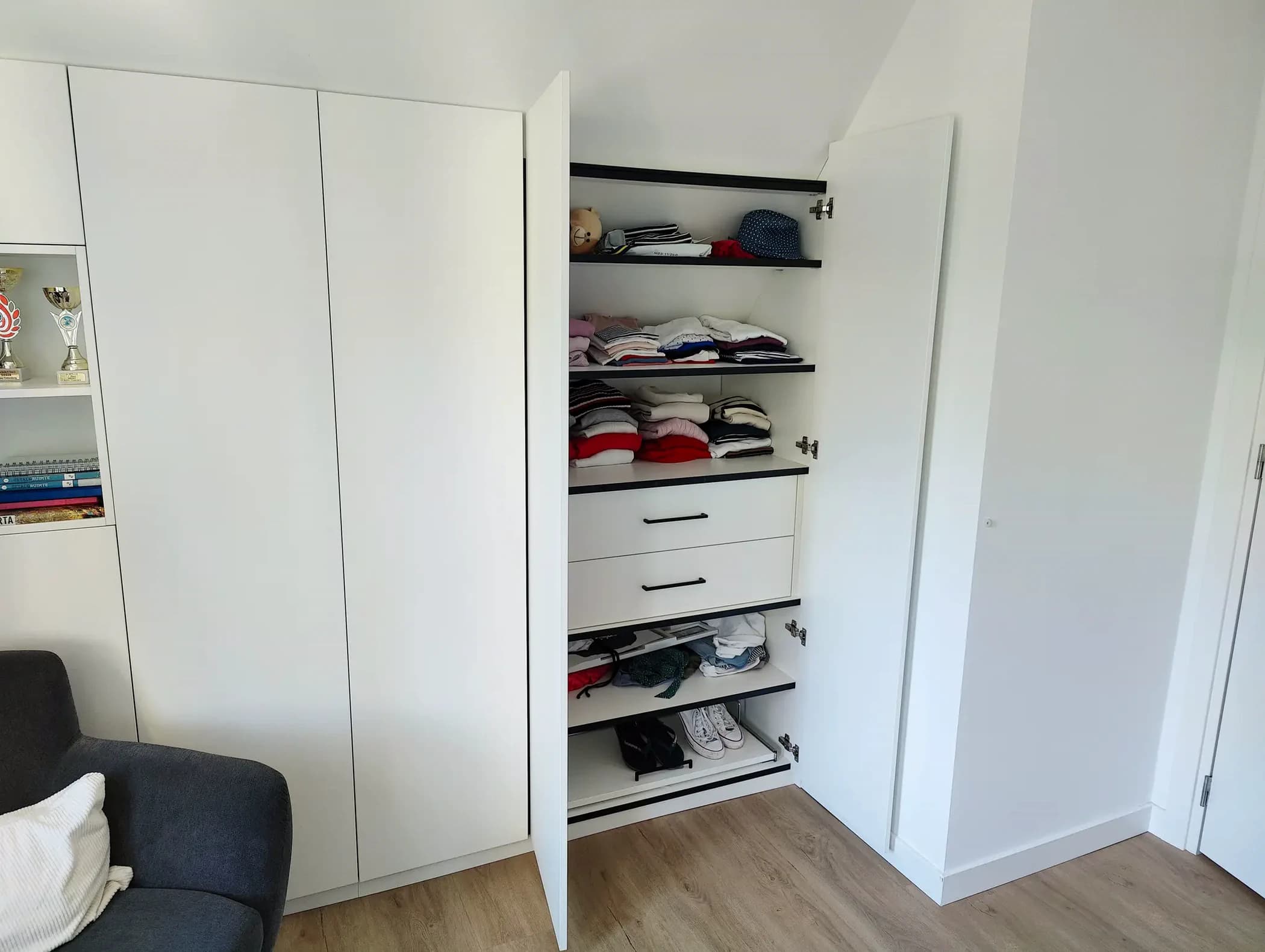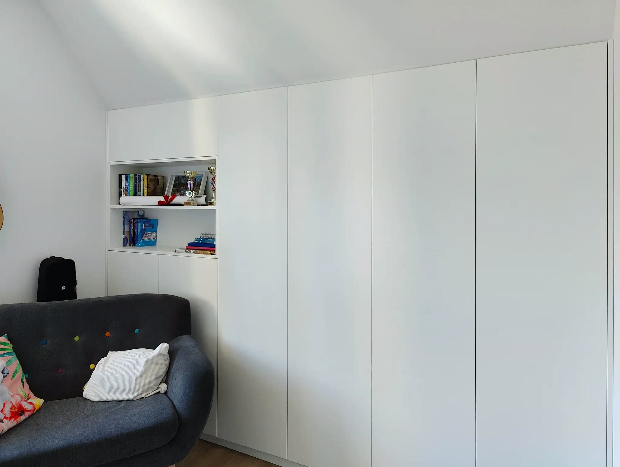 Strakke witte hoogglans kledingkast in een moderne slaapkamer in Putten.