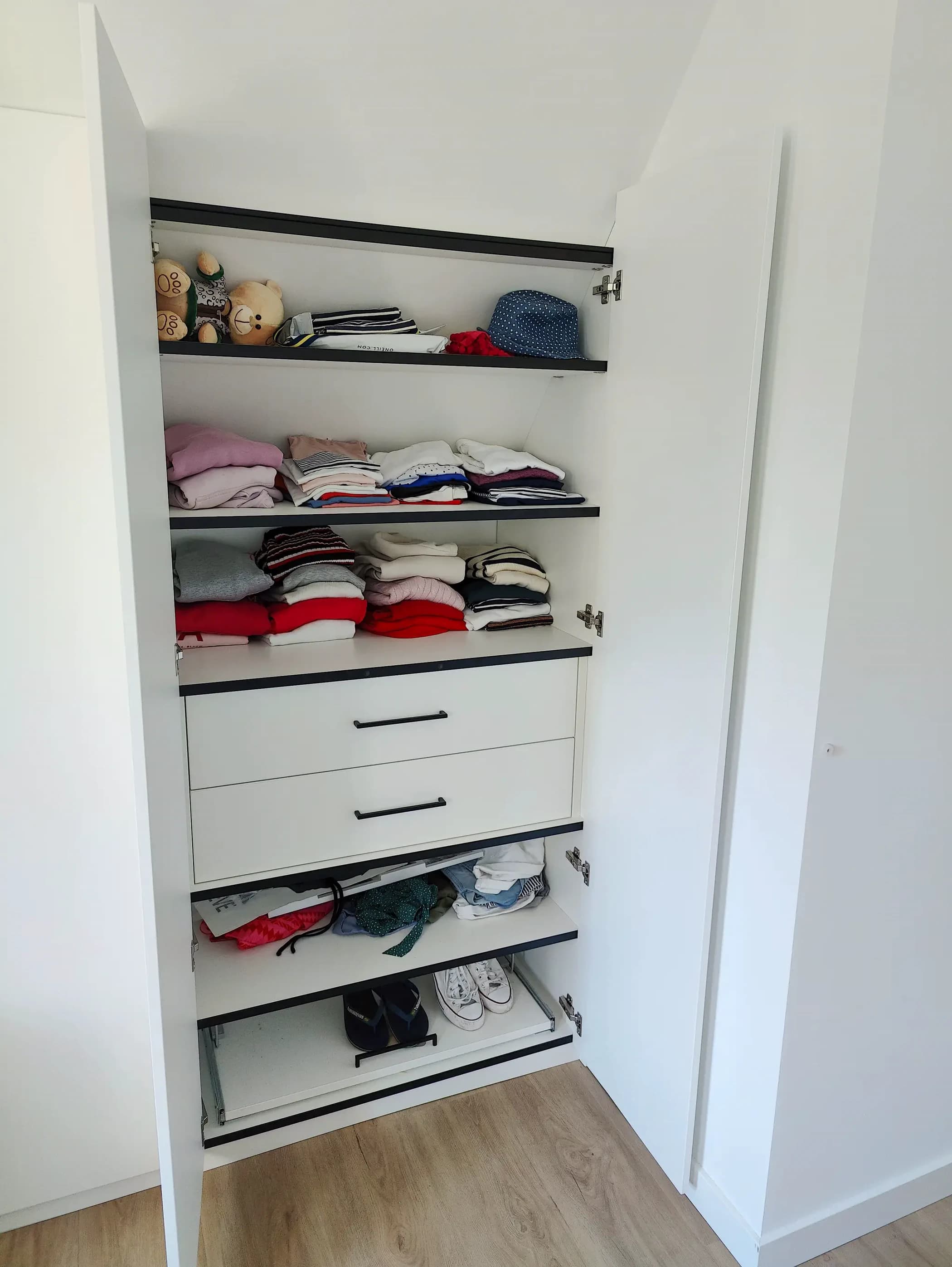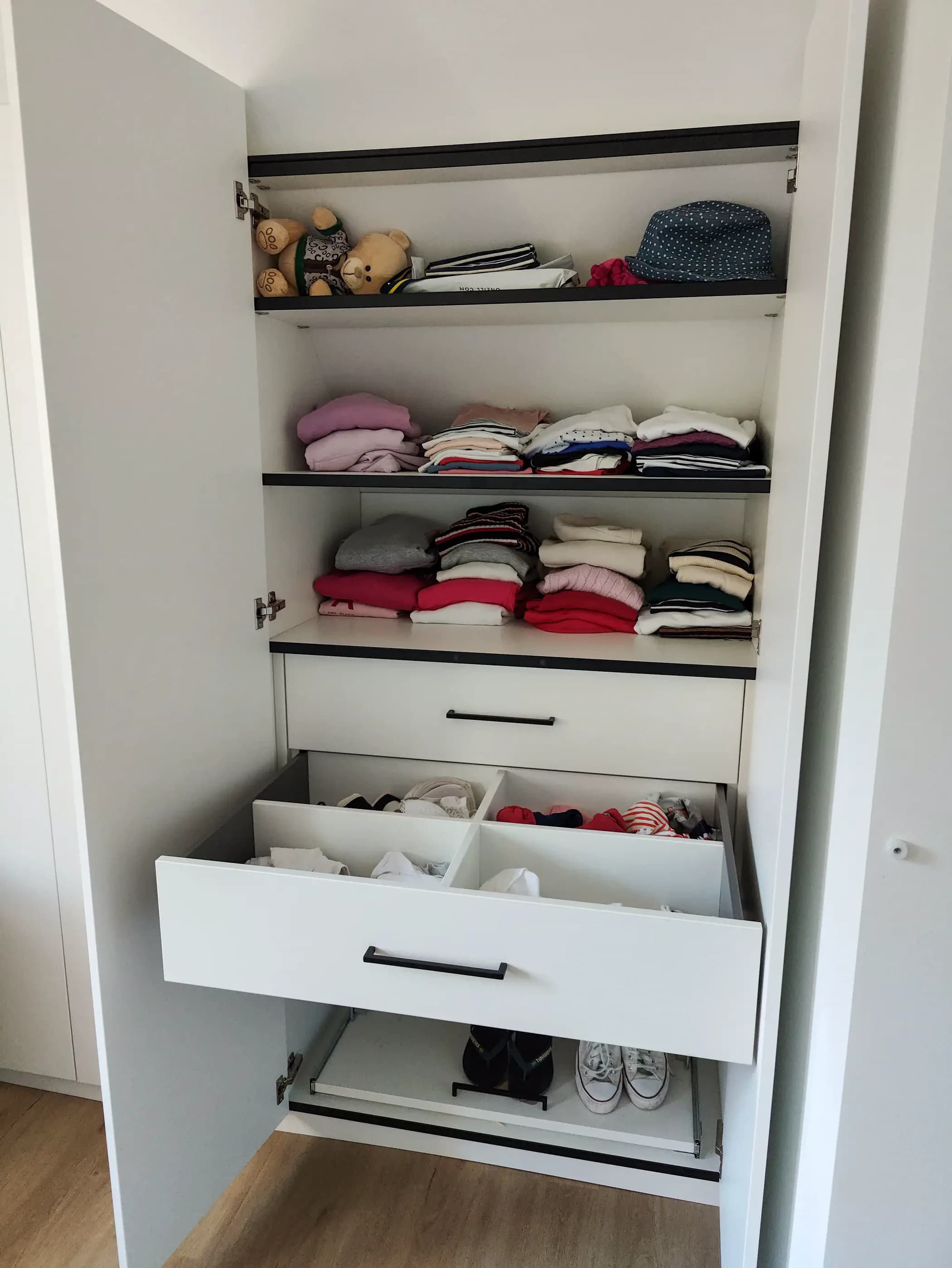 Ingebouwde zwarte kledingkast met open deuren en georganiseerd interieur in een slaapkamer in Blaricum.