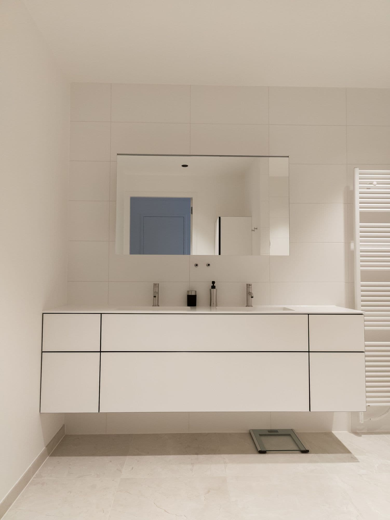 Het project in Barneveld omvat een op maat gemaakt badkamermeubel dat perfect aansluit bij de behoeften van de klant. Gekozen is voor een mat witte afwerking in combinatie met subtiele zwarte randen, die een luxe en moderne uitstraling geven. Het gebruik van materiaal W980 zorgt voor een robuuste en duurzame afwerking, ideaal voor vochtige ruimtes zoals de badkamer.