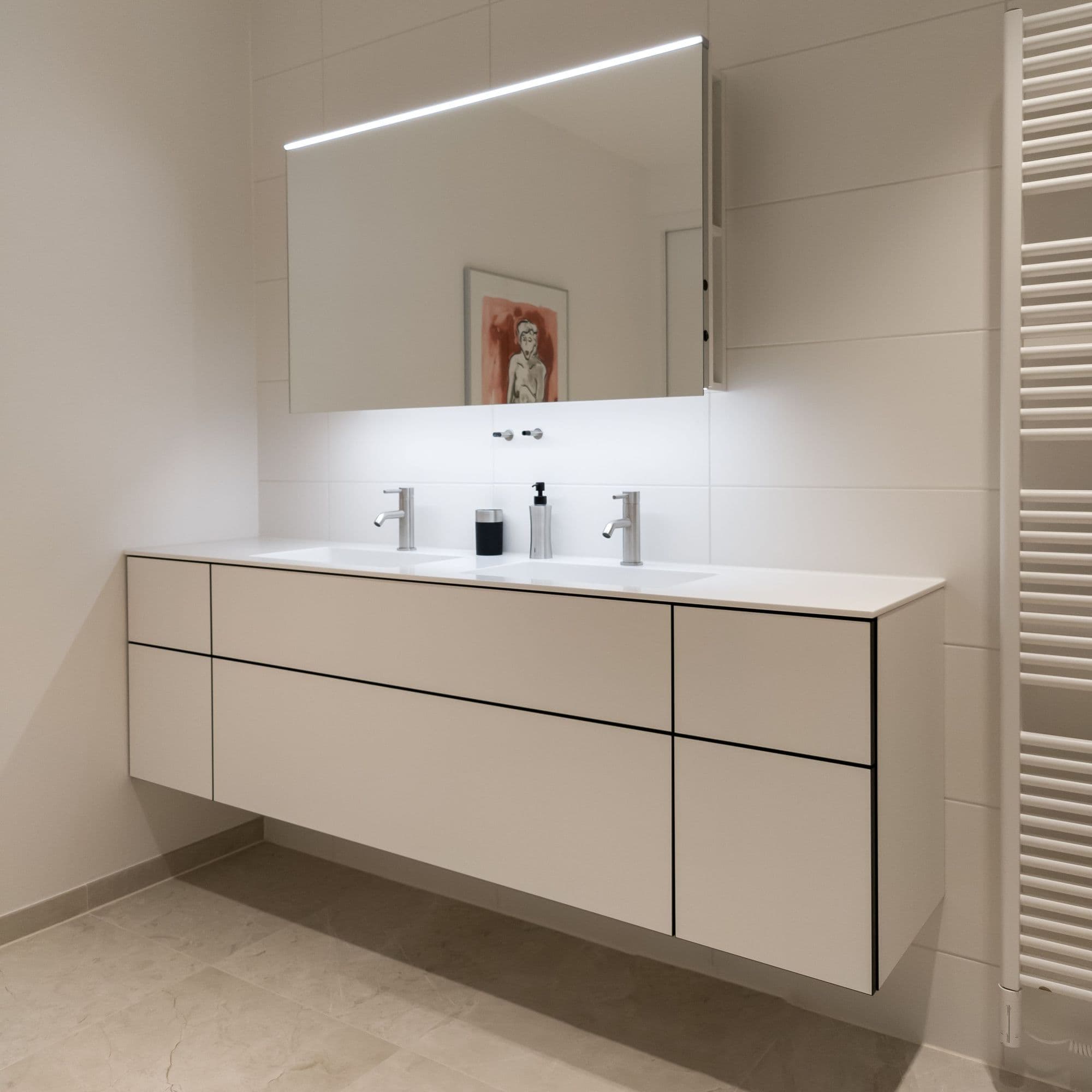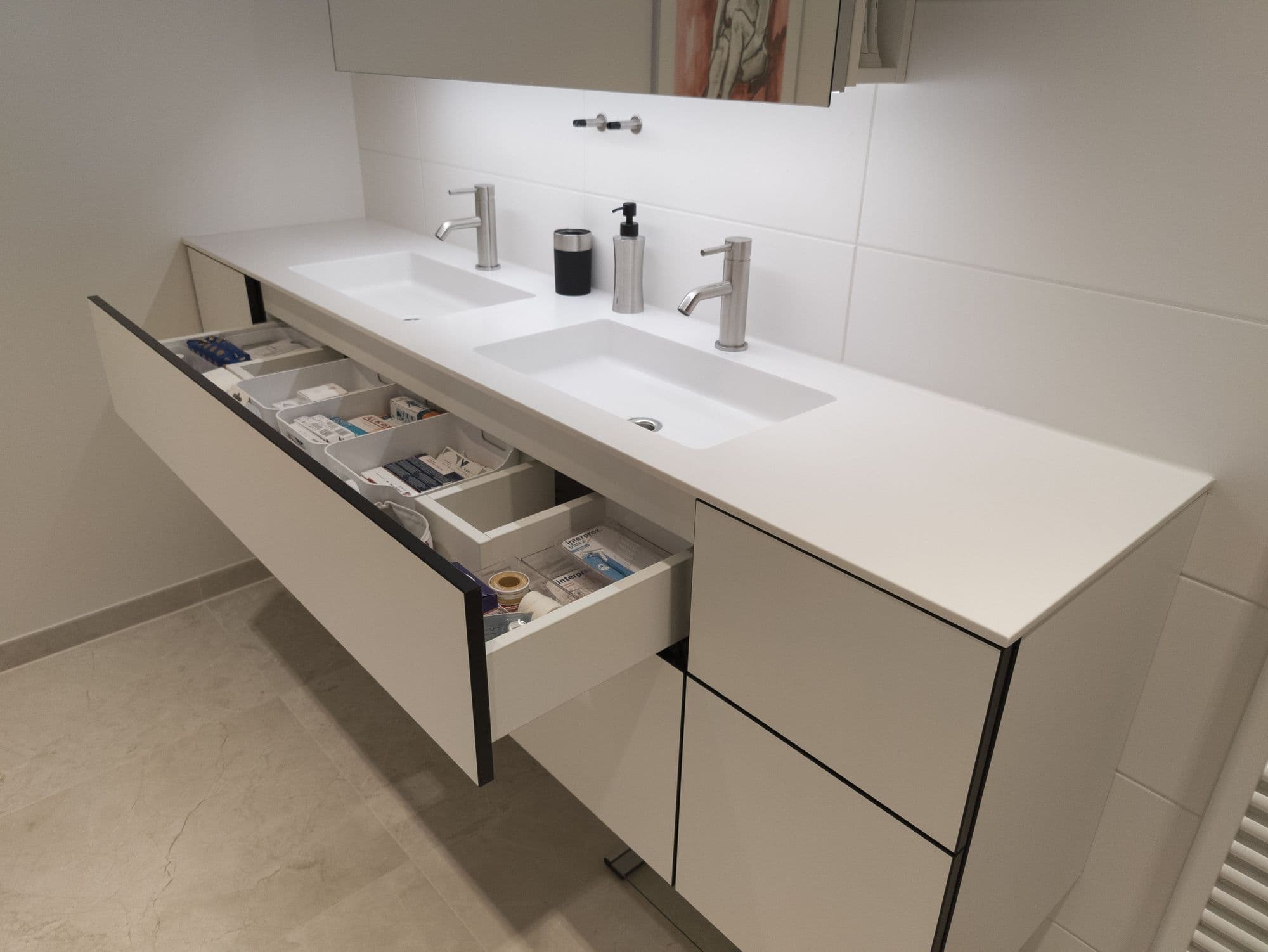 Dit zwevende badkamermeubel is ideaal voor mensen die een moderne en opgeruimde badkamer wensen. Het maatwerkdesign zorgt ervoor dat het meubel volledig aansluit bij de specifieke wensen en ruimte van de klant, terwijl de hoogwaardige afwerking een luxe uitstraling biedt.