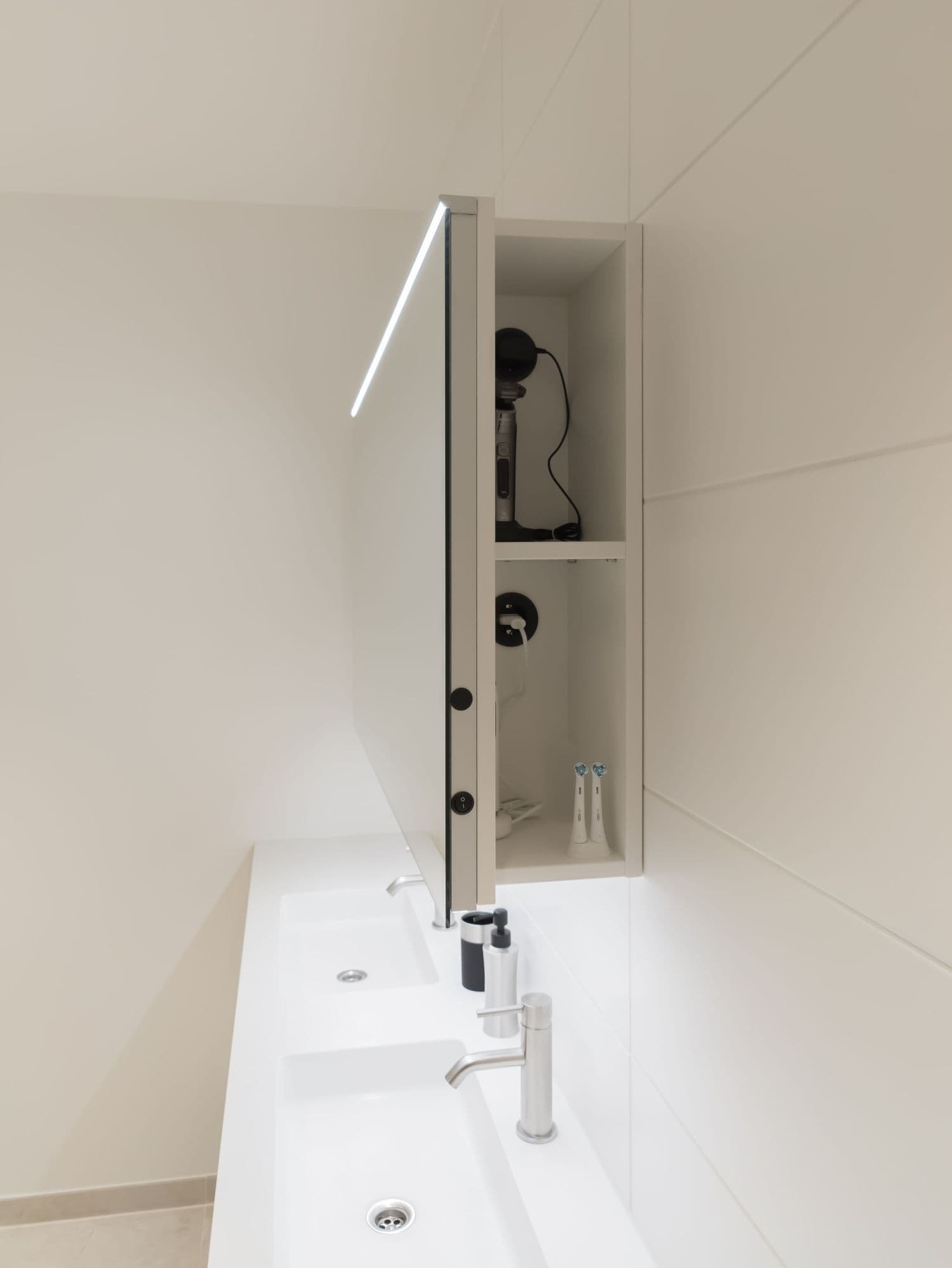 Het badkamermeubel is voorzien van een push-to-open systeem, waardoor het gebruik van handgrepen overbodig is. Dit benadrukt de strakke en minimalistische look van het meubel. Met een lichte aanraking openen de lades en deuren soepel, wat bijdraagt aan het gebruiksgemak.