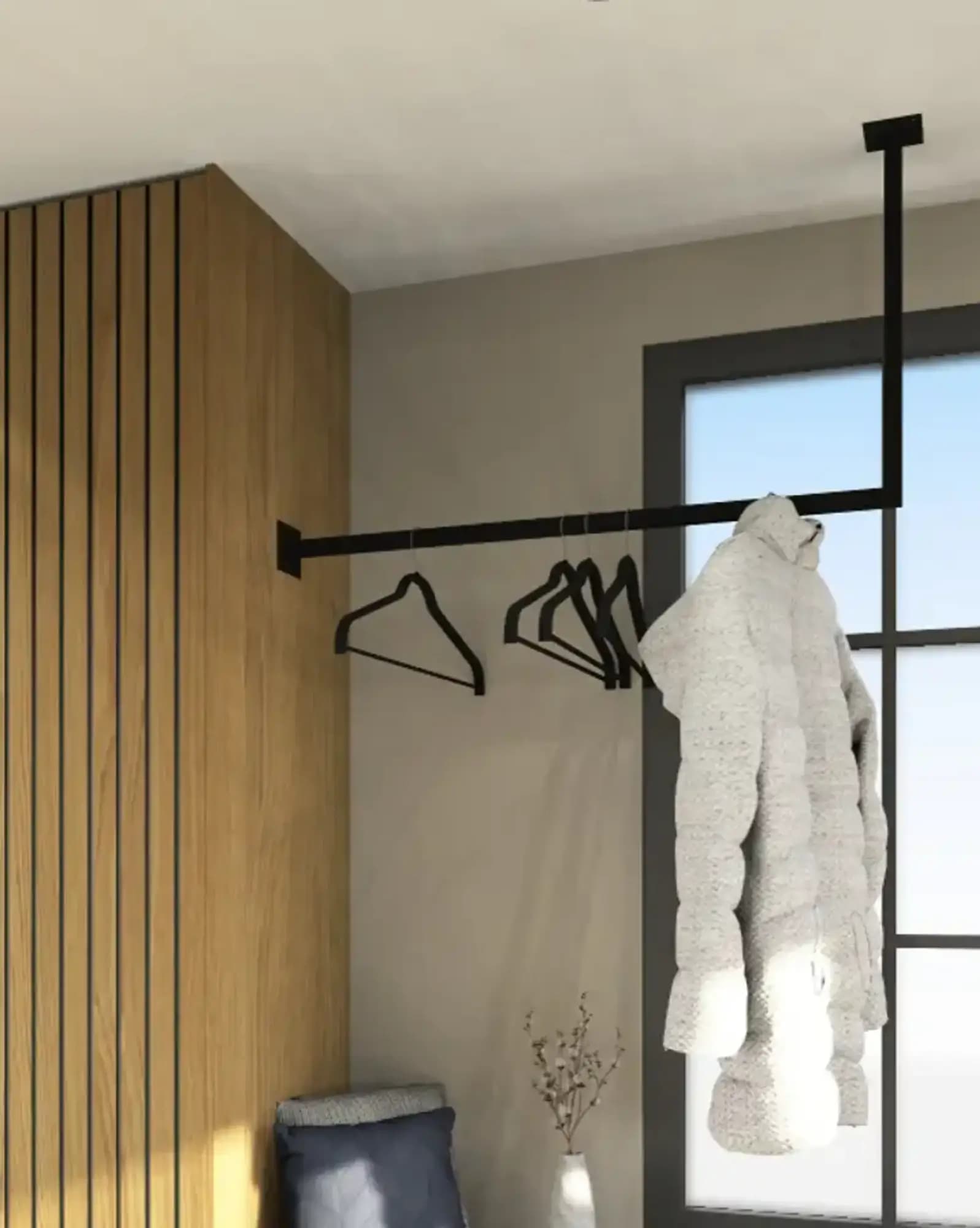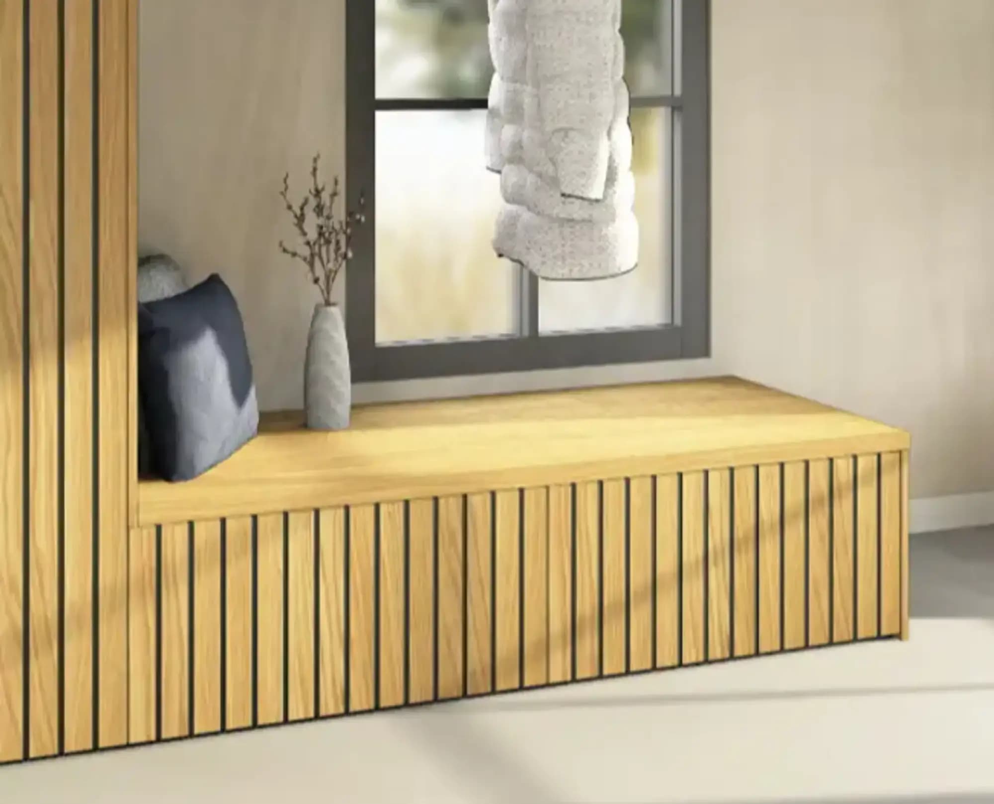 Deze eiken garderobekast is stijlvol maatwerk voor de entree. De kast heeft een latteneffect, wat zorgt voor een warme, rustige sfeer. Aan de buitenkant is een zwarte stalen roede bevestigd, die niet alleen functioneel is, maar ook een mooi contrast vormt met het hout. Het opbergbankje is naadloos geïntegreerd en loopt precies onder het kozijn door, met daaronder een praktische ruimte voor het opbergen van schoenen. Ontdek de mogelijkheden, de materialen en de kosten van deze eikenhouten garderobekast voor in de hal.