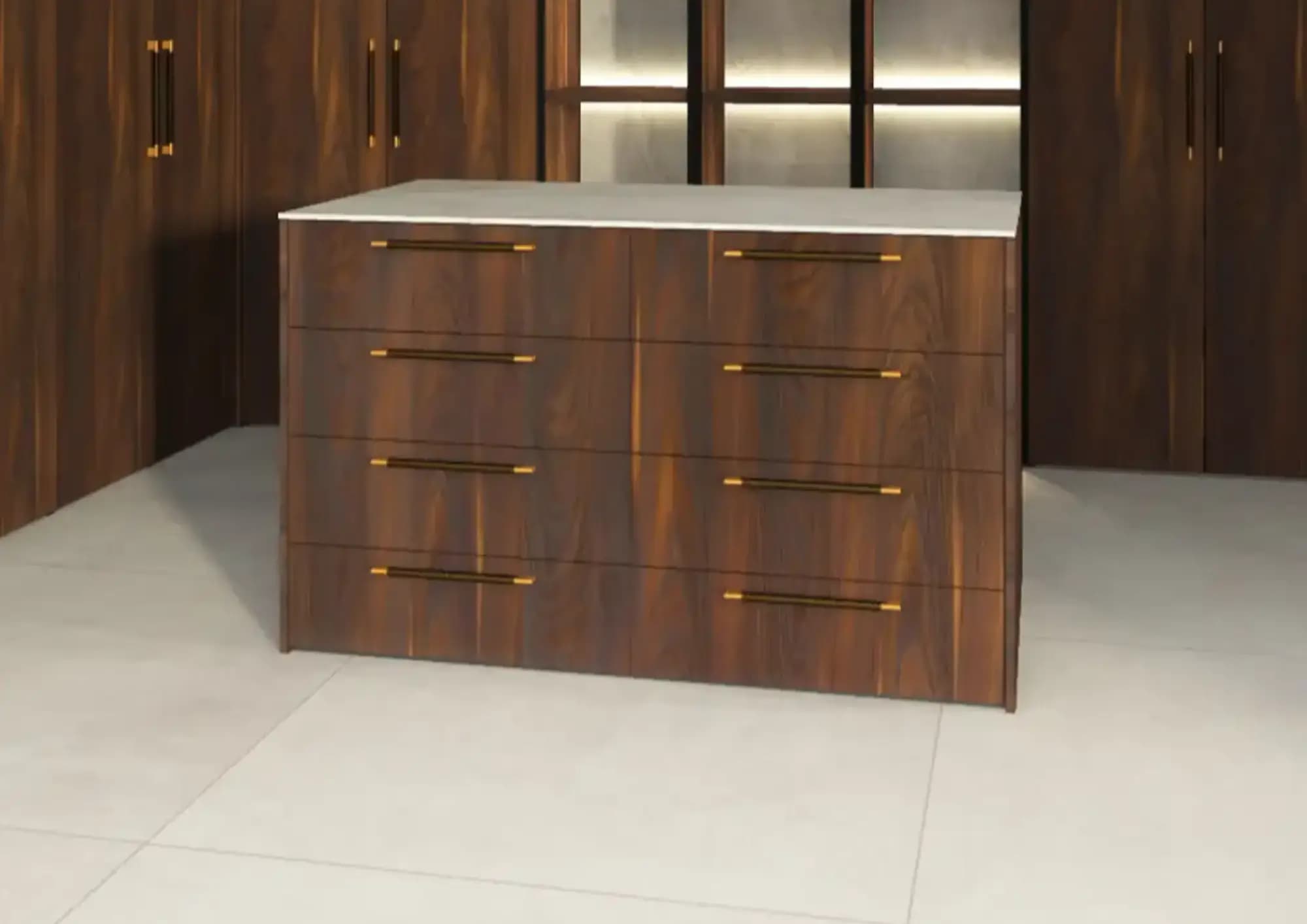 Deze luxe inloopkast heeft een klassiek karakter en een verfijnde uitstraling dankzij het marmeren blad en de achterwand. Toon uw mooiste mode-items achter elegante glazen deuren, terwijl geïntegreerde ledverlichting in roeden en legplanken alles perfect in het licht zet. Praktische details zoals een lade voor overzichtelijk opbergen van ondergoed en sokken en een speciale sieradenlade maken deze kast helemaal compleet. Dankzij de slimme indeling en het ruime opbergeiland wordt elke centimeter. Ontdek de mogelijkheden, materialen en kosten van deze walk in closet op maat.