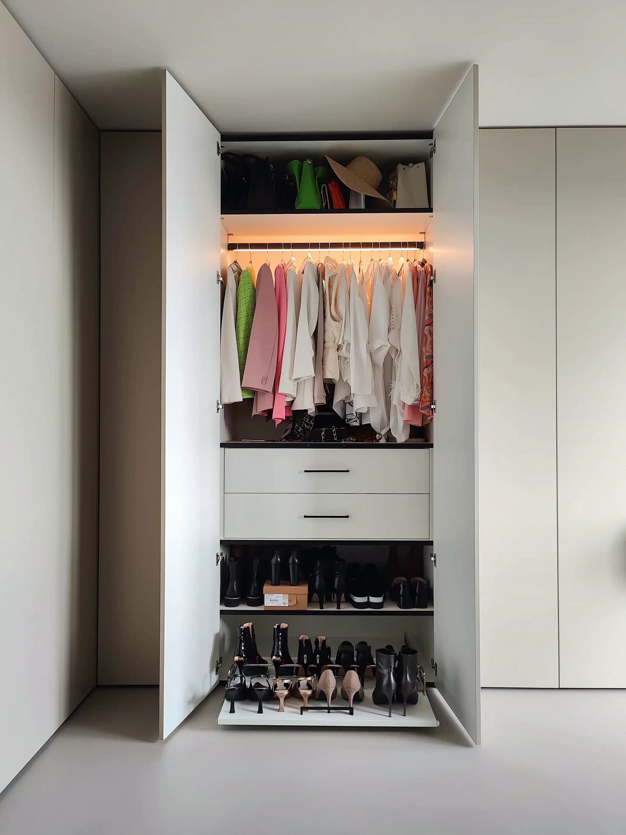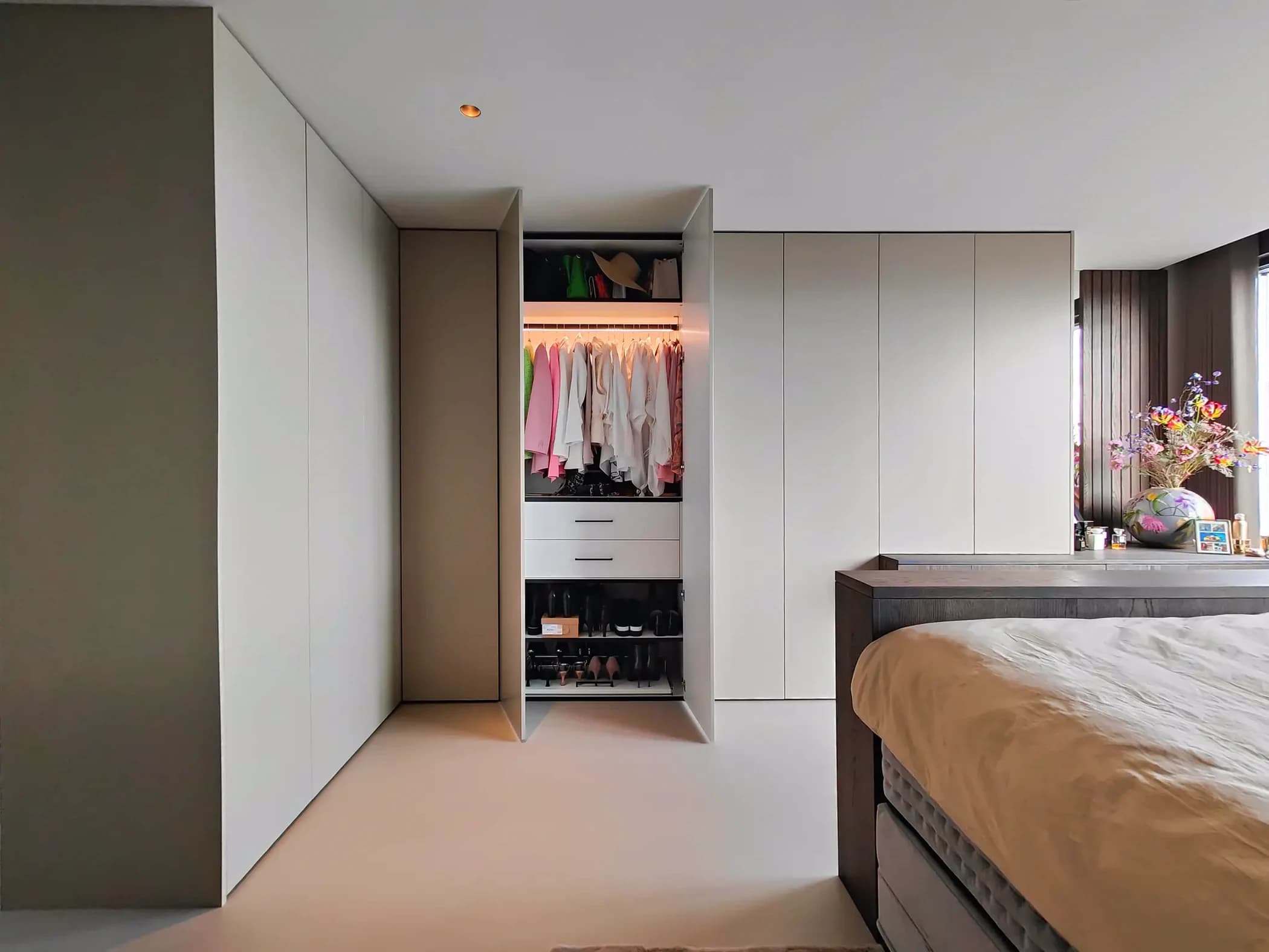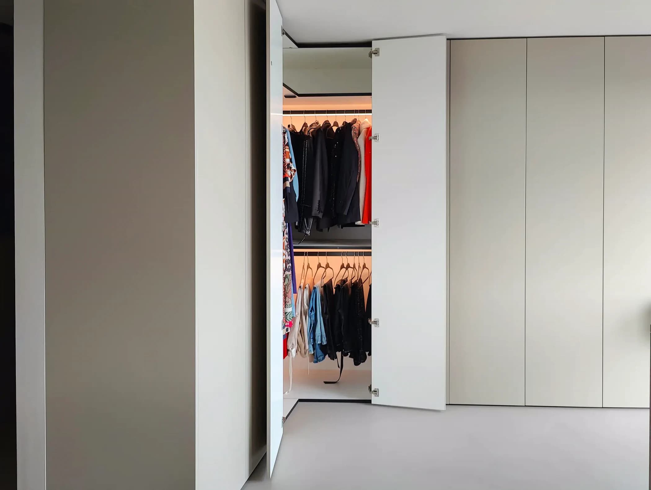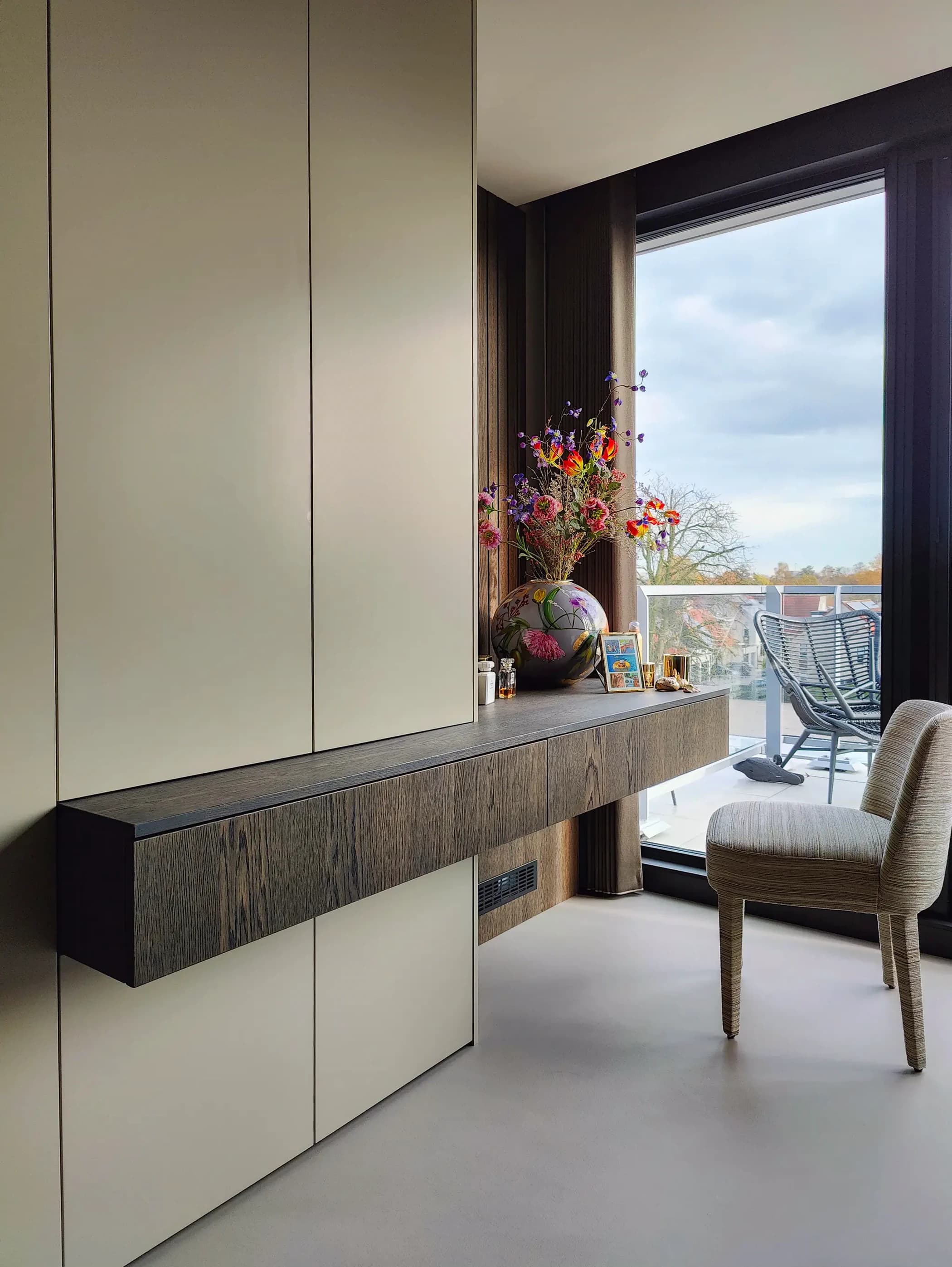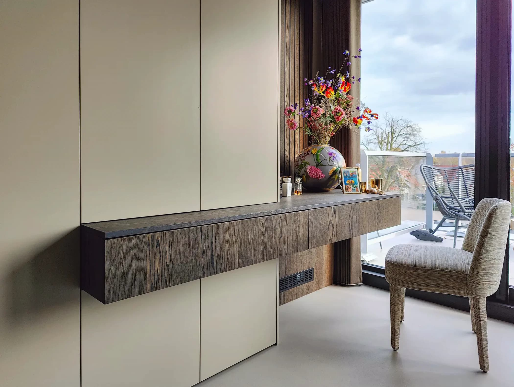 Voor een woning in Veenendaal realiseerden we deze moderne kledingkast op maat met geïntegreerd bureau, volledig afgestemd op de ruimte. De kast is uitgevoerd in MDF en eiken fineer, afgewerkt in zijdeglans spuitwerk. Dankzij de greeploze draaideuren, het latjeseffect en het minimalistische ontwerp ontstaat een rustige en stijlvolle uitstraling. De slimme indeling met push to open laden en een geïntegreerde werkplek maakt dit meubel zowel praktisch als esthetisch sterk.