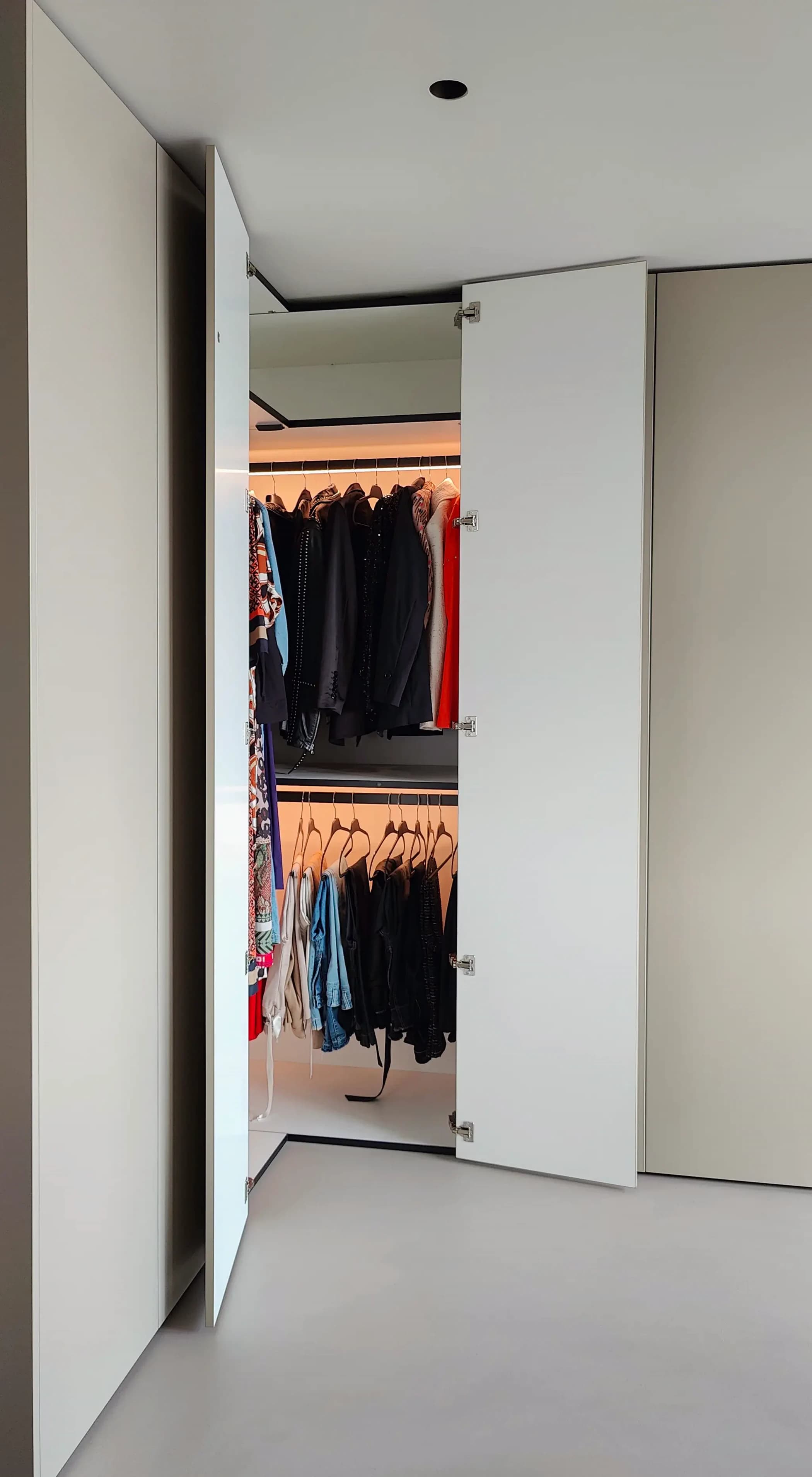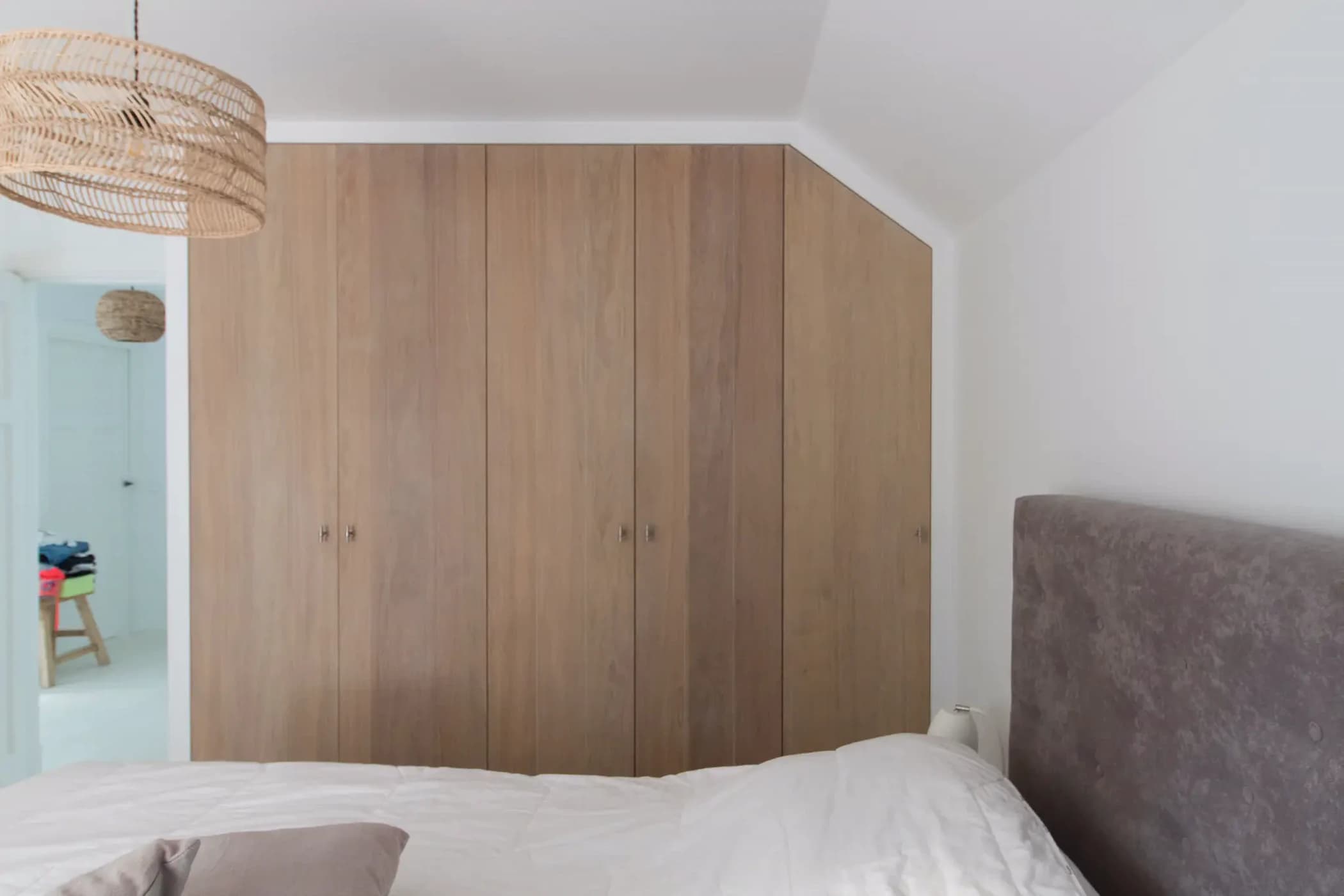 Deze maatwerk draaideurkast is ontworpen met strakke, greeploze deuren die openen met een push-to-open systeem. De verticale latjes op de fronten zorgen voor een subtiele ritmiek in het ontwerp zonder dat het onrustig oogt. De fijne afwerking in zijdeglans en het gebruik van eiken fineer zorgen voor een warme en moderne uitstraling. Een kast die opgaat in het interieur, maar wel degelijk aanwezig is door zijn verfijnde details.