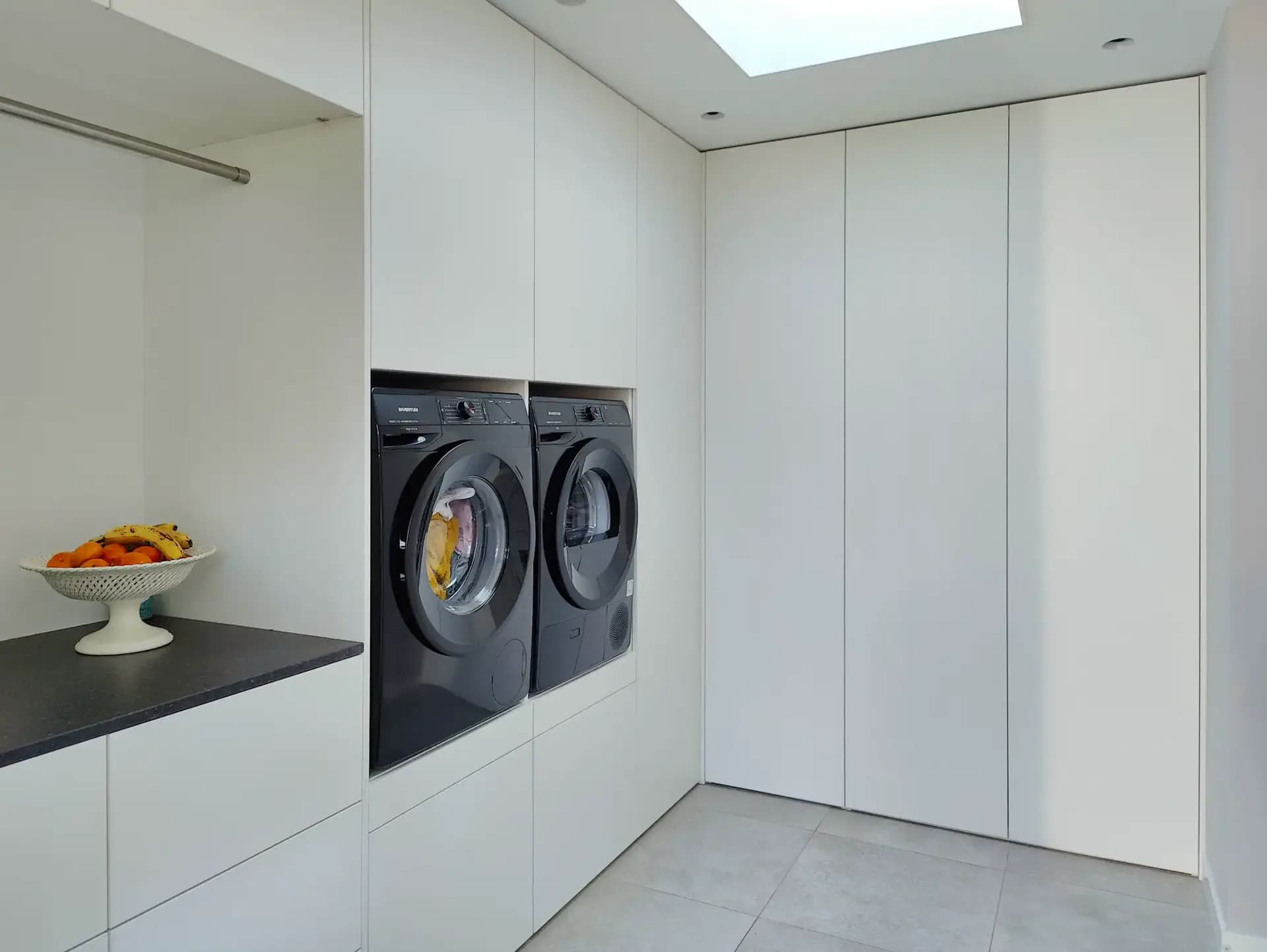 Deze bijkeukenkast biedt een slimme oplossing voor het netjes wegwerken van wasmachine en droger. Door beide apparaten volledig te integreren in het kastontwerp, blijft de bijkeuken opgeruimd en overzichtelijk. De kastdeuren sluiten strak af dankzij het moderne push-to-open systeem, waardoor de apparaten alleen zichtbaar zijn wanneer dat nodig is. Ideaal voor wie een praktische én esthetische oplossing zoekt voor wasmachine in kast.