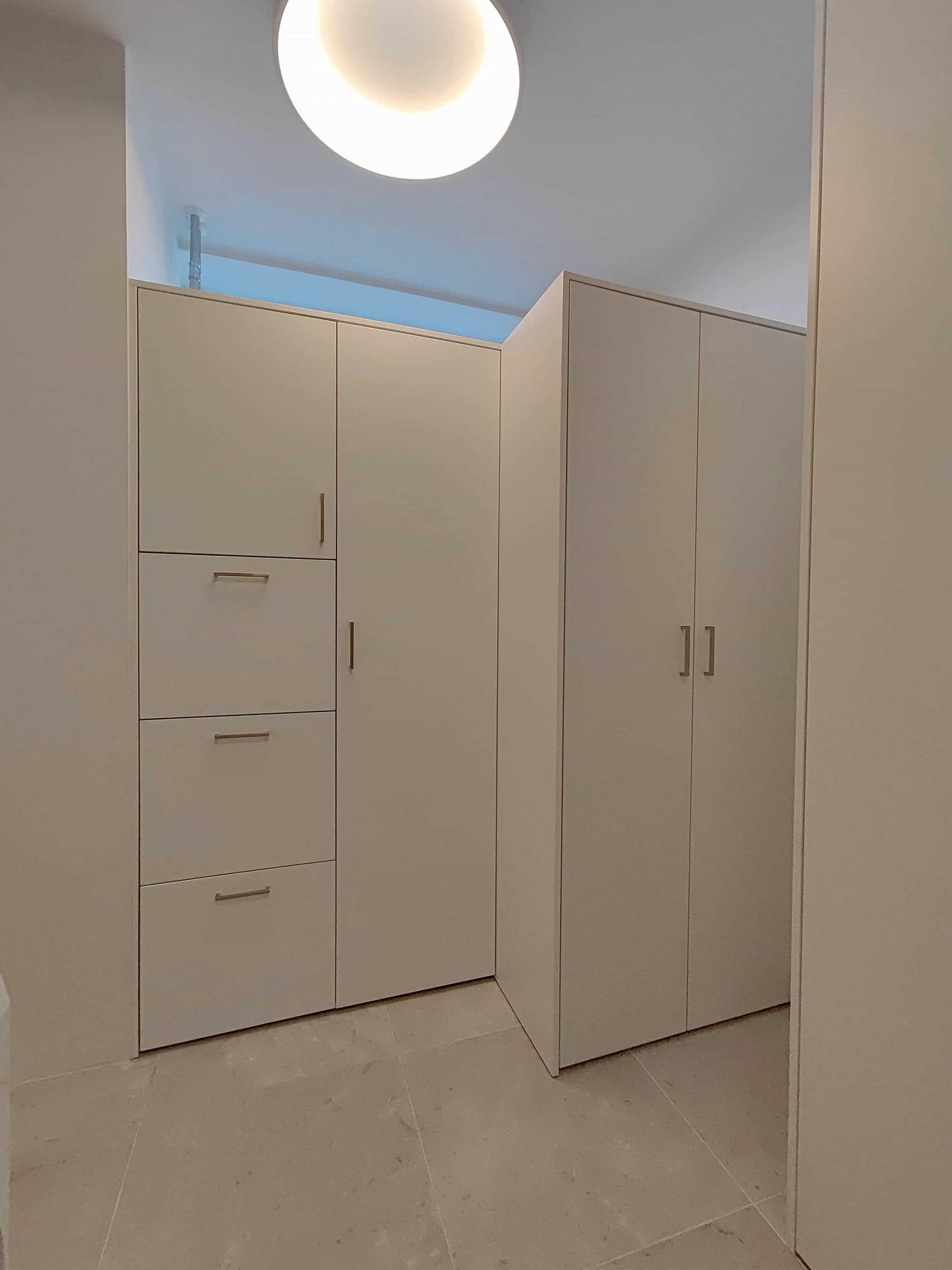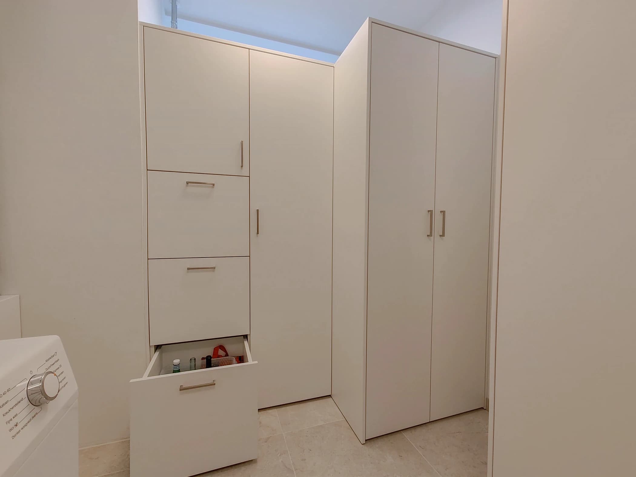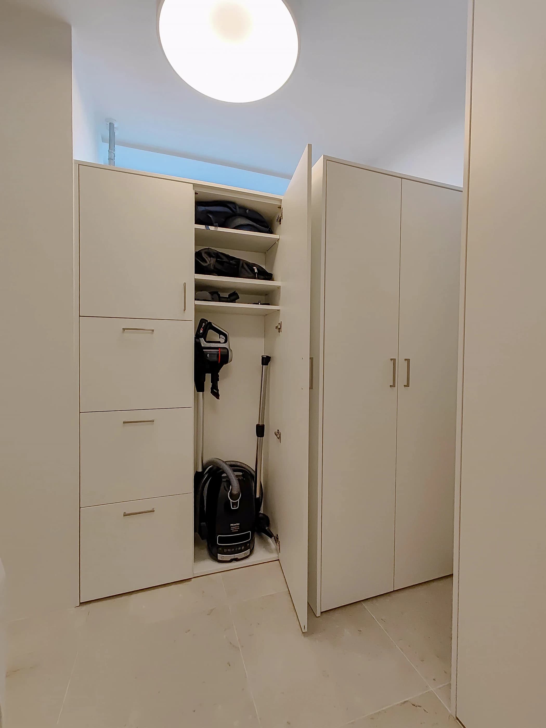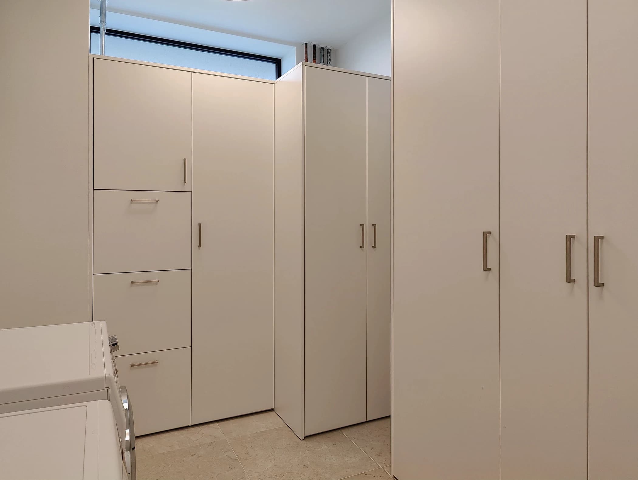 Deze op maat gemaakte bijkeukenkast combineert functionaliteit en stijl in een moderne mat witte afwerking. Met een ingebouwde warmtepomp en royale opbergruimte, biedt deze kastoplossing maximale efficiëntie en ruimtegebruik in de bijkeuken.