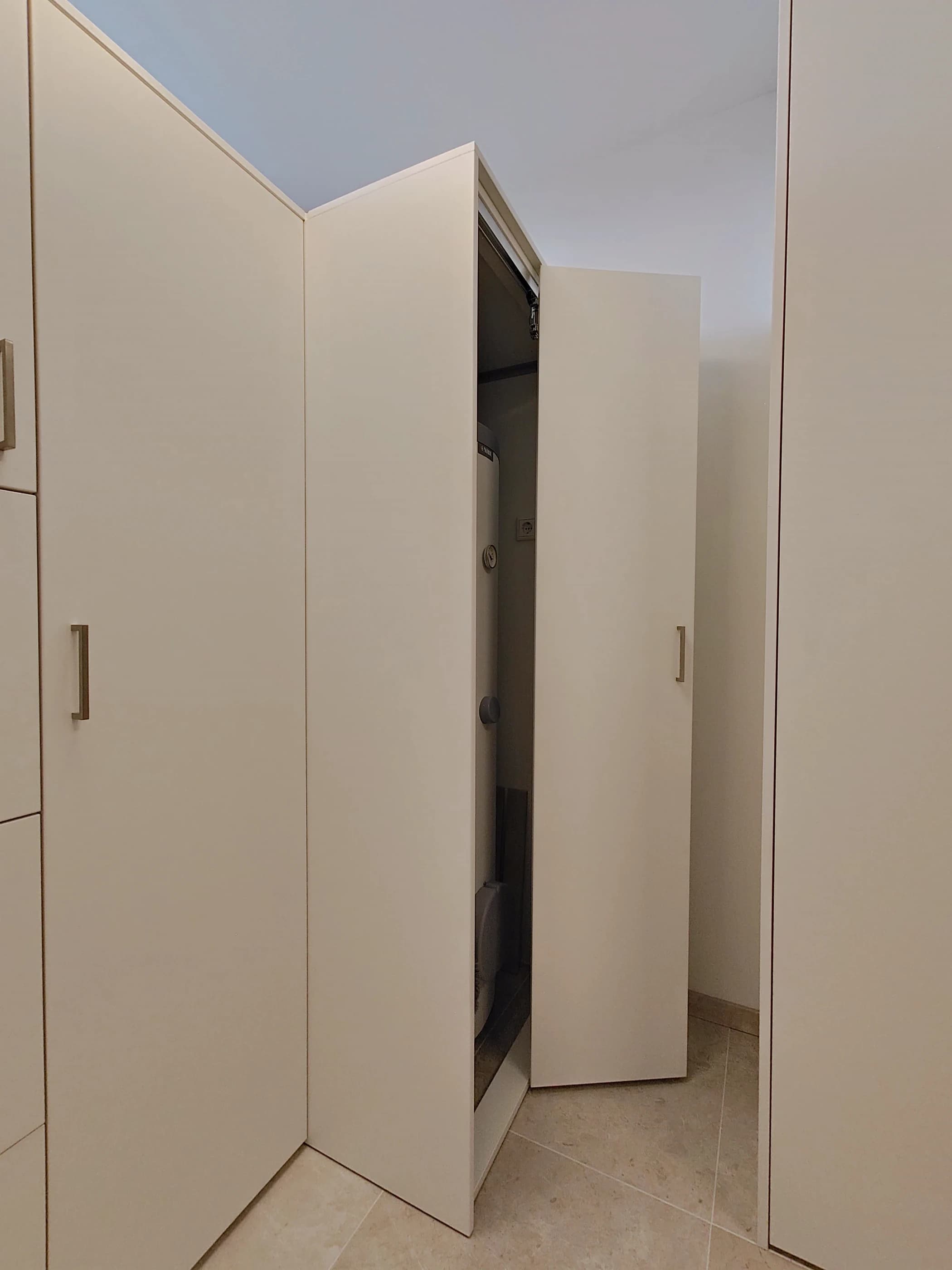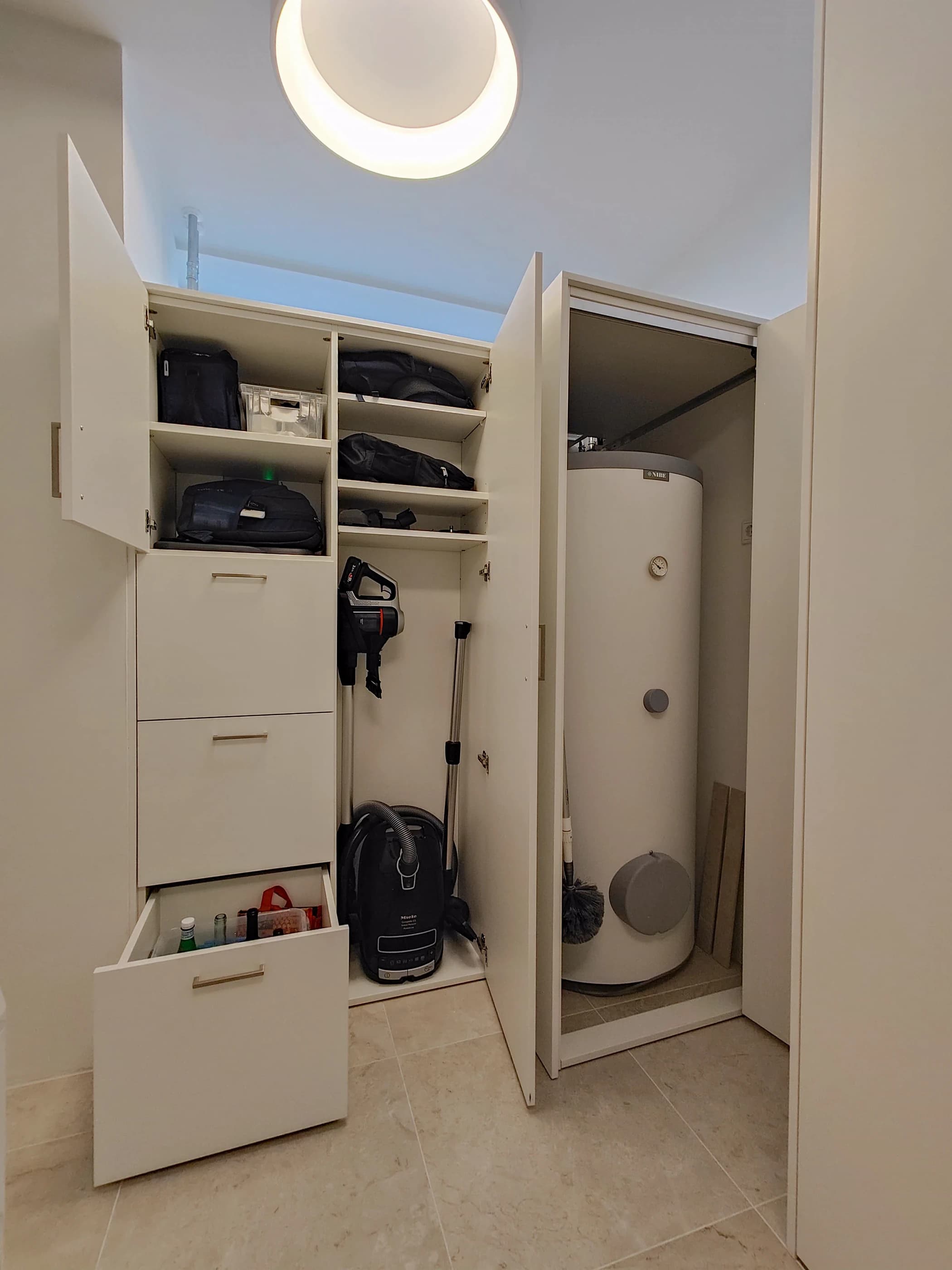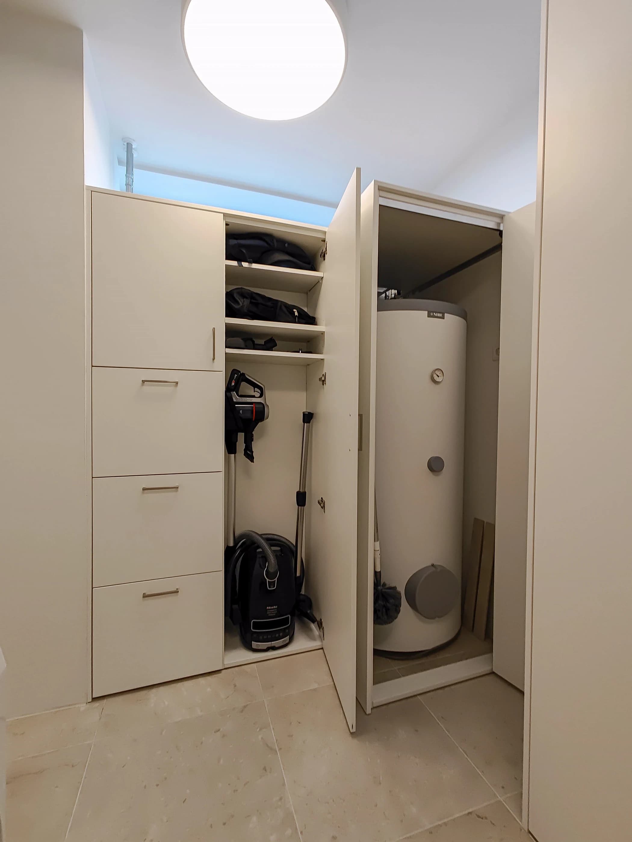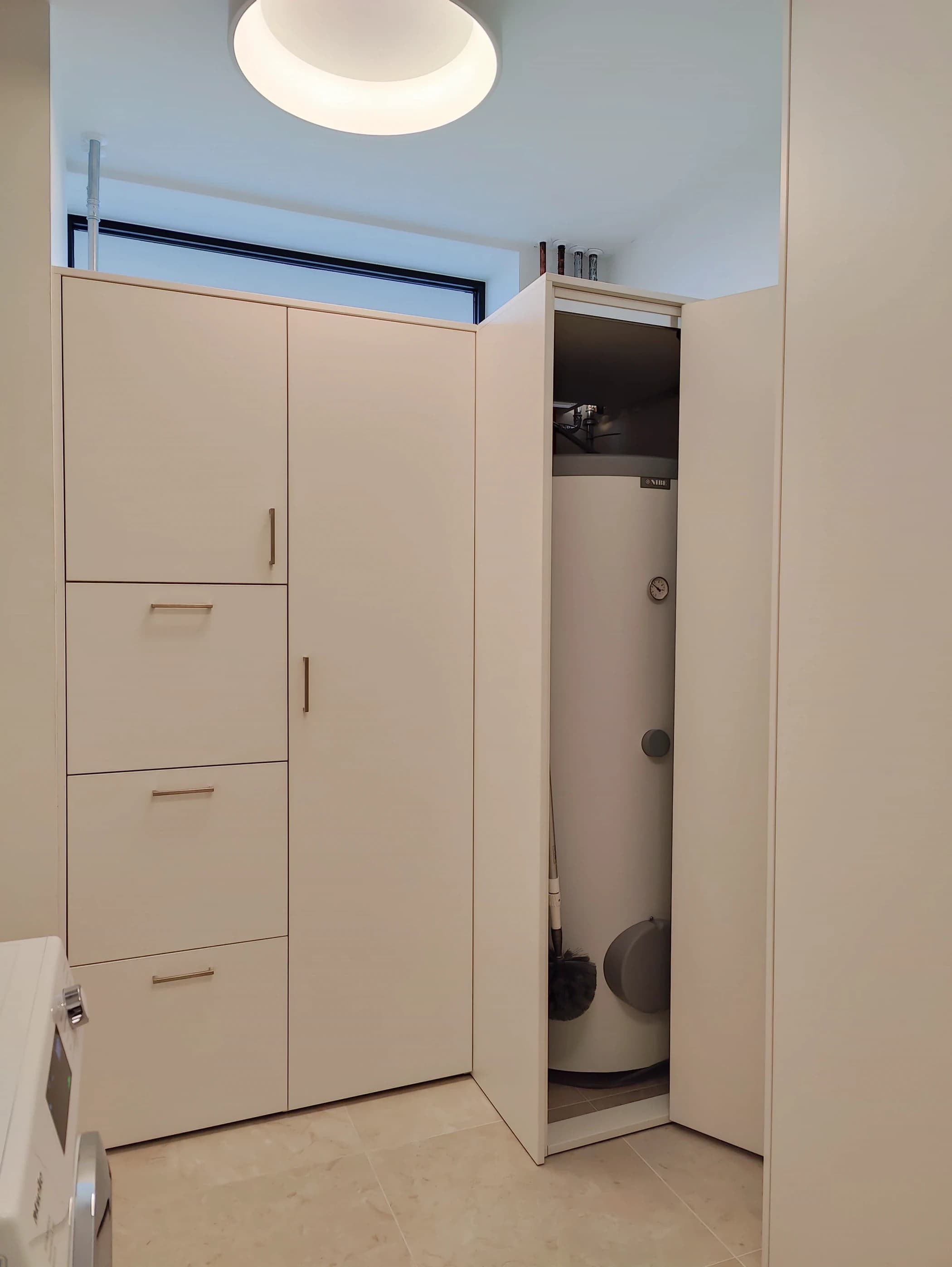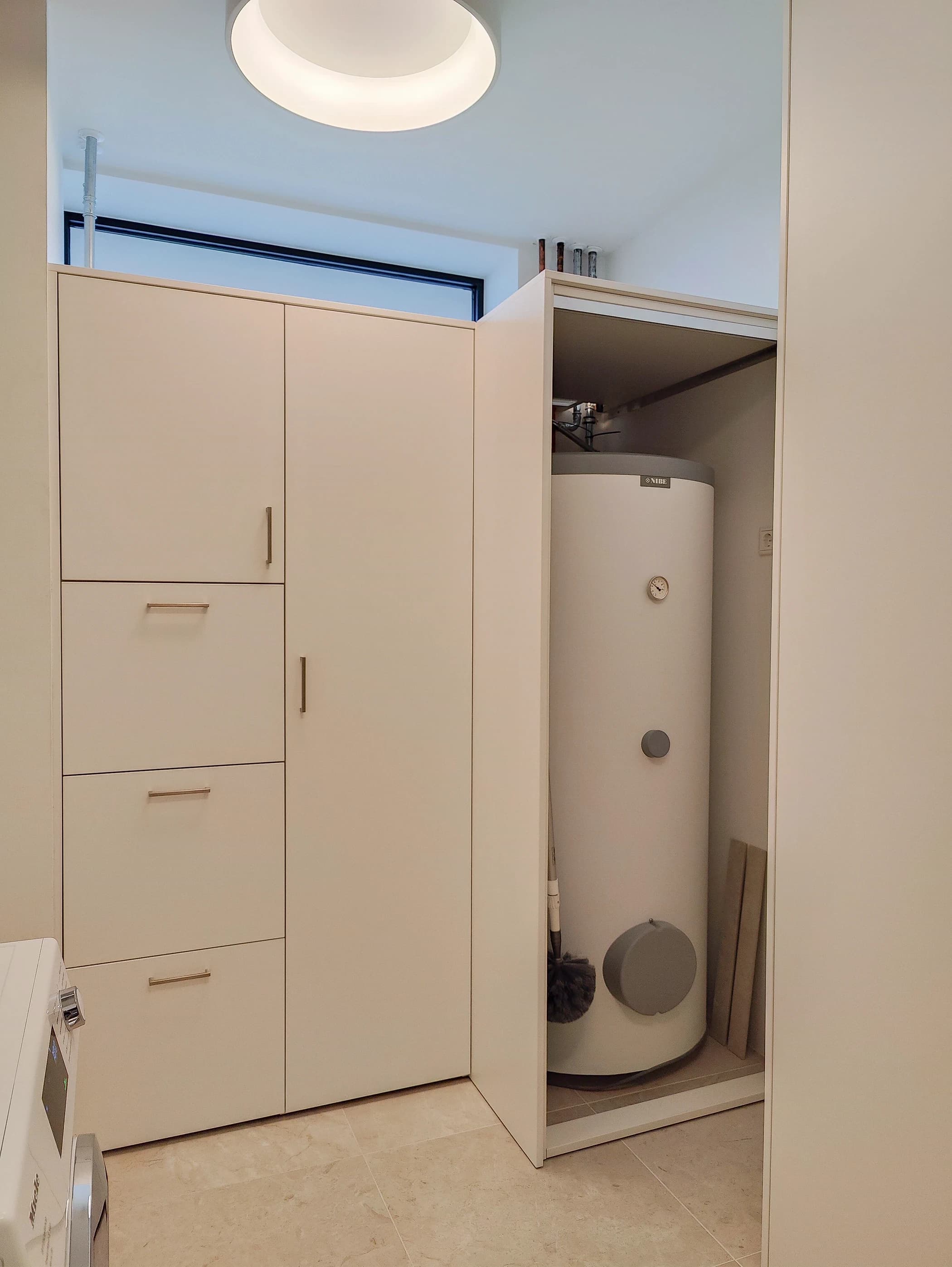 Deze op maat gemaakte bijkeukenkast is een inspiratiebron voor iedereen die op zoek is naar bijkeukeninrichting met maximale functionaliteit en een moderne uitstraling. Door de integratie van de warmtepomp wordt niet alleen ruimte bespaard, maar ontstaat er ook een rustgevende, nette uitstraling in de ruimte. Deze kastenwand is een perfecte oplossing voor klanten die hun bijkeuken efficiënt en stijlvol willen inrichten.
