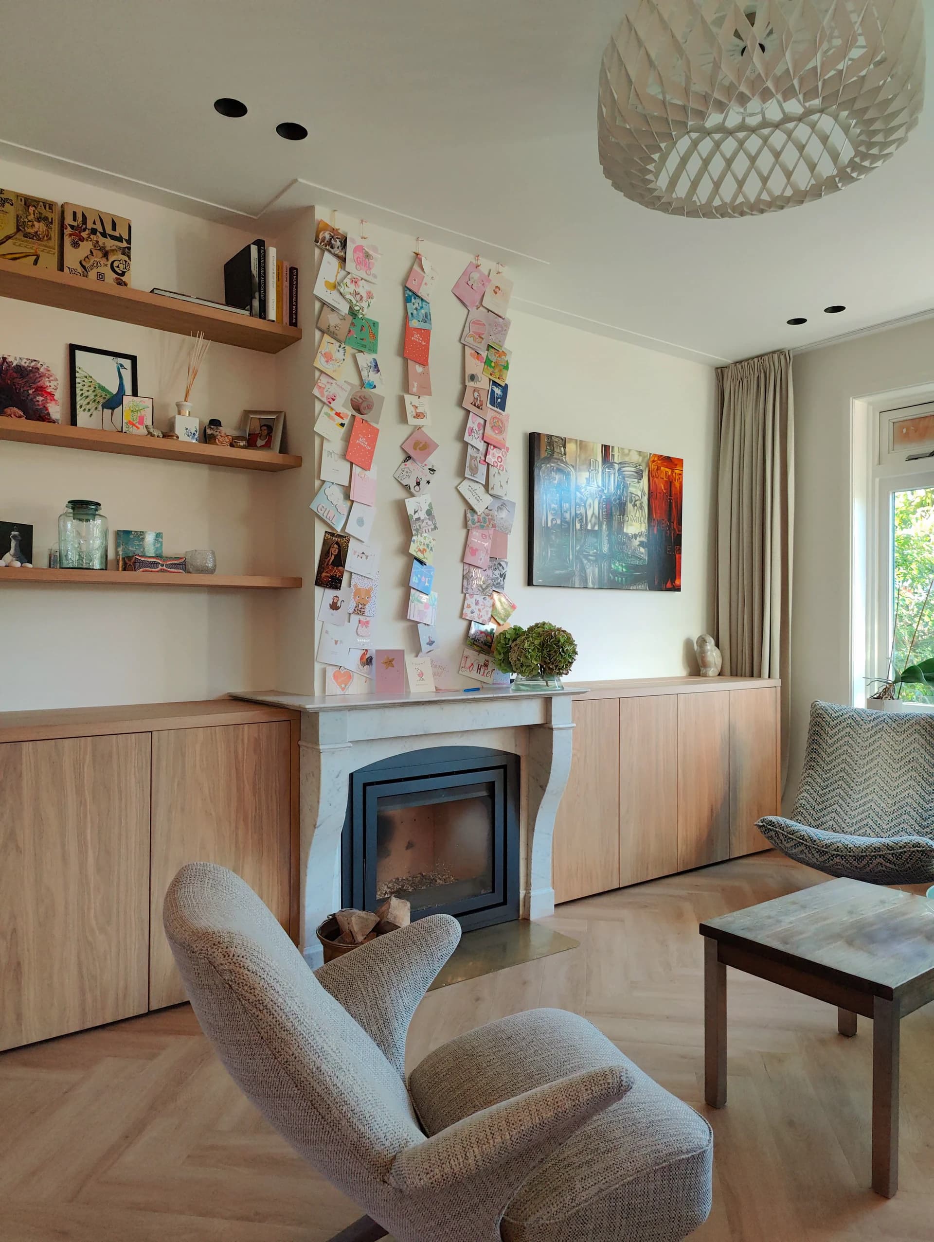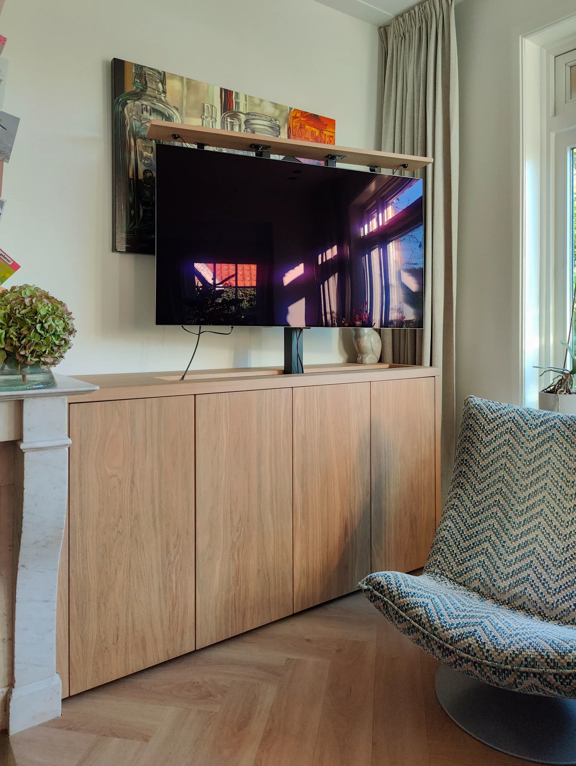 Deze prachtige eiken wandmeubel met TV-lift biedt een perfecte combinatie van functionaliteit en stijl in uw woonkamer. Vervaardigd uit eiken fineer en afgewerkt met een oliebehandeling, straalt deze kast een natuurlijke en warme uitstraling uit. De maatwerk kast is vakkundig geplaatst aan weerszijden van de schouw van de kachel. Aan de linkerzijde biedt de kast voldoende bergruimte met kastjes en drie blinde planken die de gehele wand vullen. Aan de rechterkant bevindt zich de TV, die dankzij de geïntegreerde lift eenvoudig kan verdwijnen in de kast eronder. Dit unieke meubelstuk voegt niet alleen praktische opbergruimte toe, maar zorgt ook voor een strakke en opgeruimde look in de woonkamer.