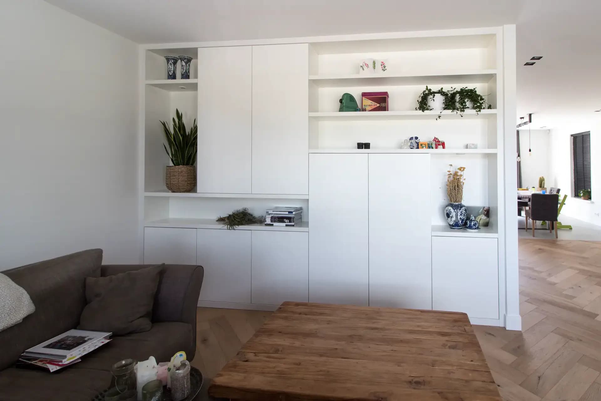 In Zutphen realiseerden we een moderne inloopboekenkast op maat, volledig afgestemd op de beschikbare ruimte én het leesplezier van de klant. Deze lichte en open boekenkast, uitgevoerd in wit gemelamineerd MDF, is ontworpen als een inloopkast voor boeken en creëert een bibliotheekgevoel in huis. De kast biedt volop ruimte aan boeken, tijdschriften en accessoires en vormt tegelijkertijd een stijlvolle aanvulling op het interieur.