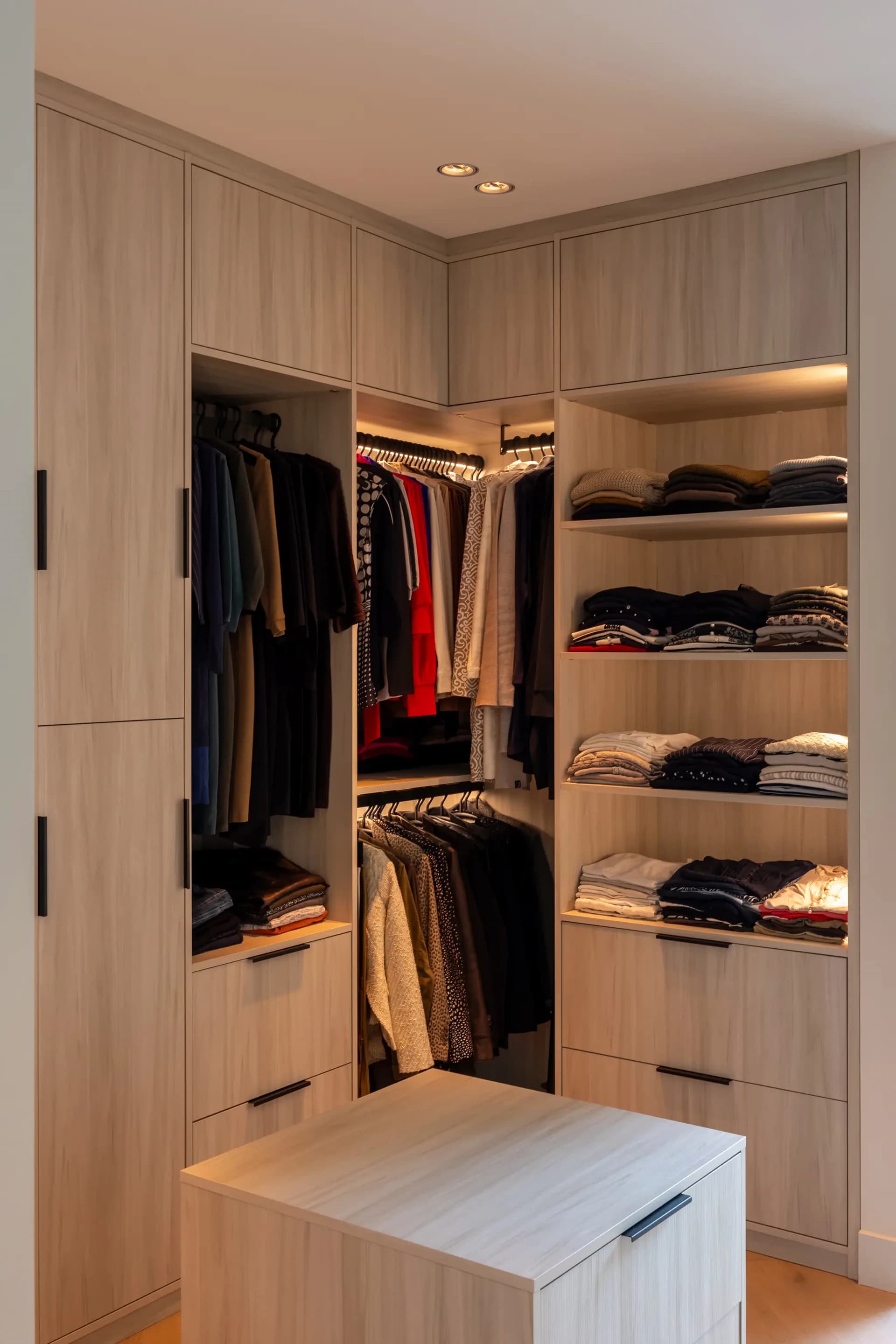 Deze kledingkast op maat is voorzien van subtiele ledverlichting die zorgt voor een warme, uitnodigende sfeer. De verlichting benadrukt de structuur van de LS63 Ceppo-afwerking en maakt het vinden van kleding eenvoudig, zelfs in de vroege ochtend. Het samenspel van licht, kleur en materiaal maakt deze kast tot een verfijnde toevoeging aan de slaapkamer.