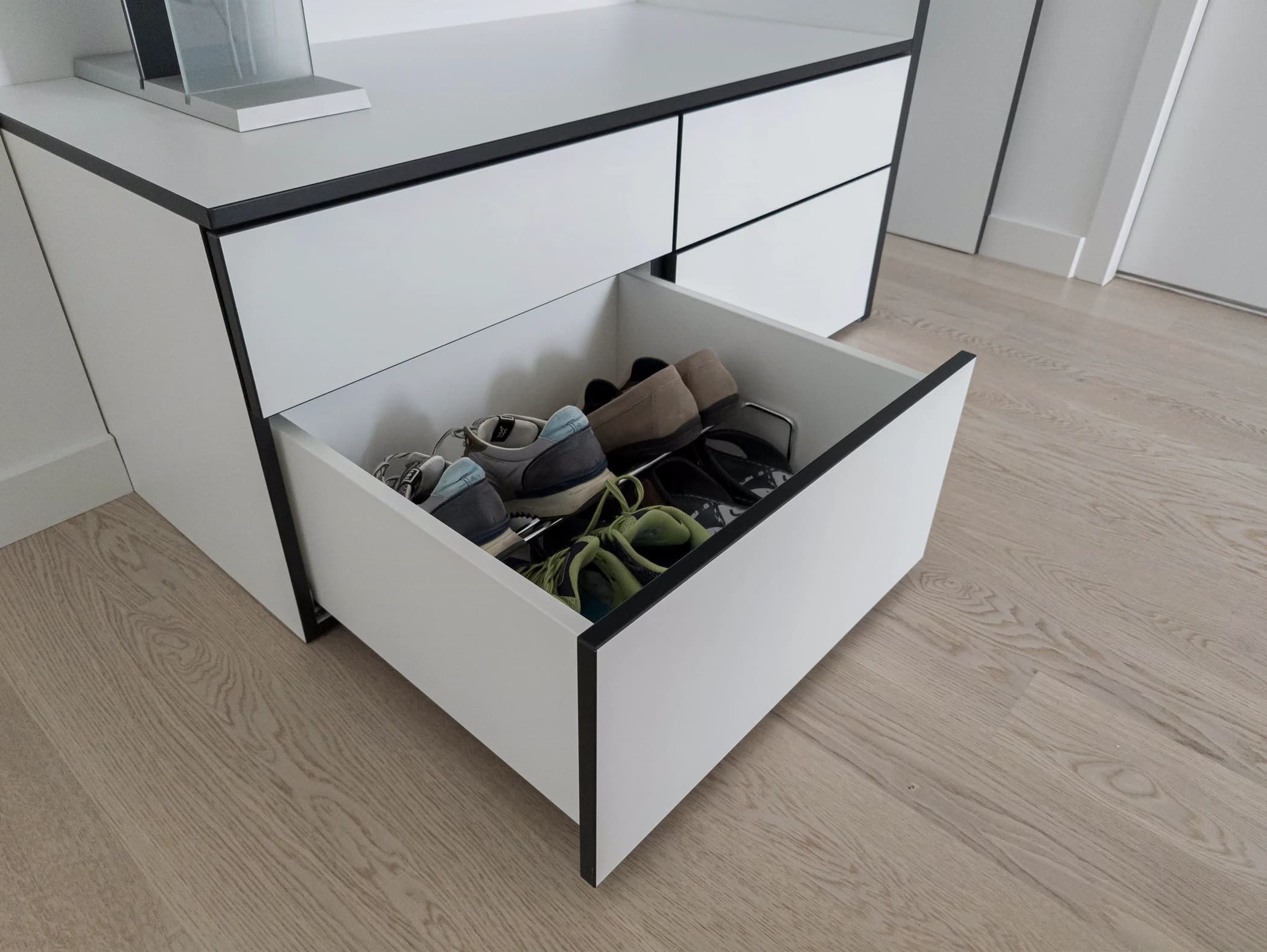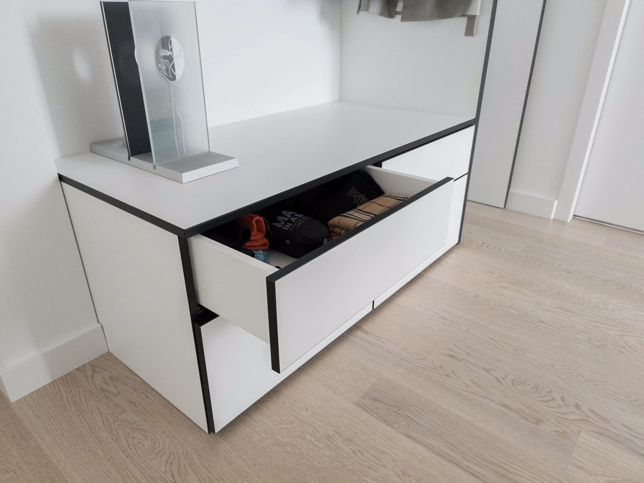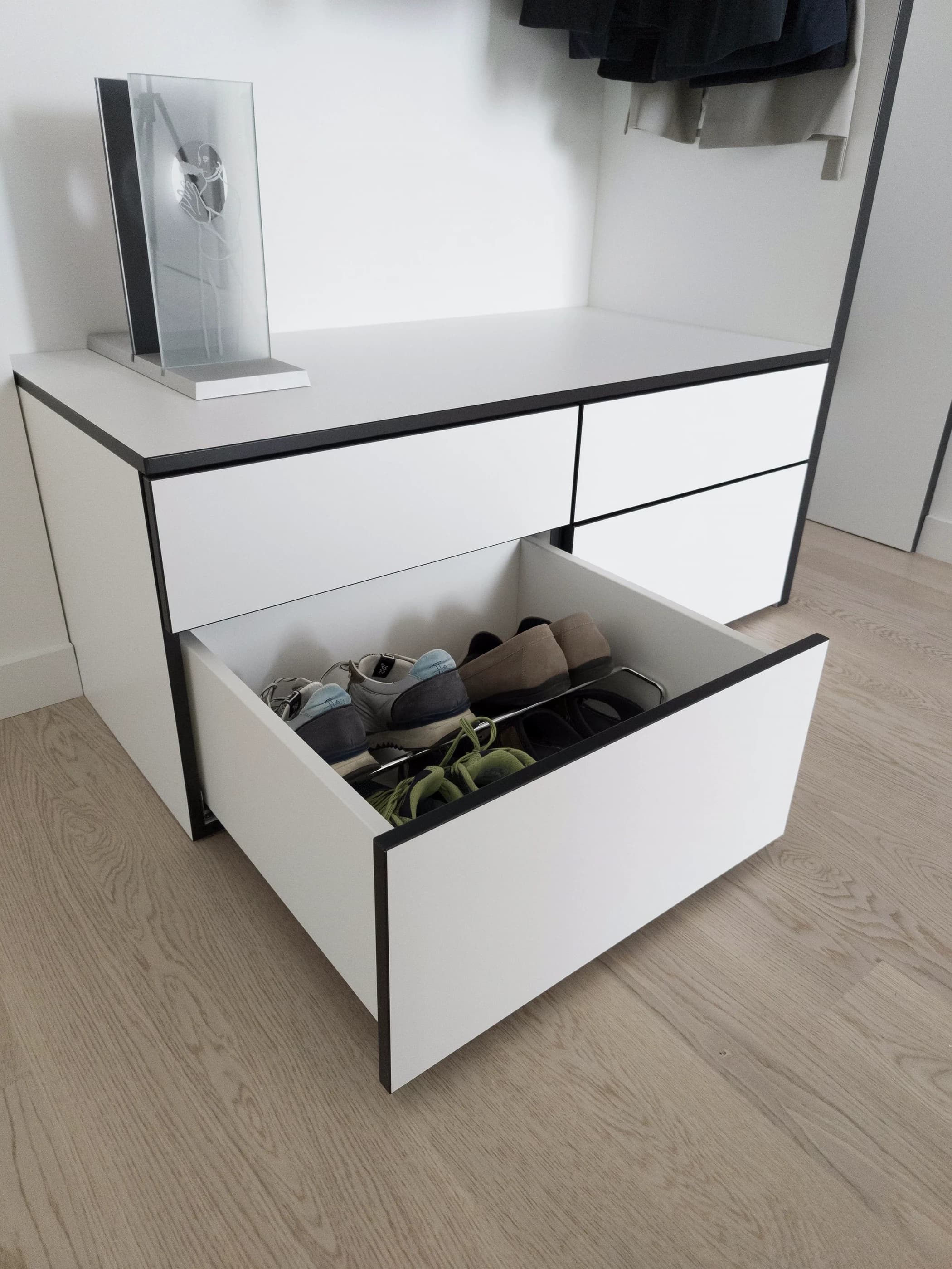 De klant wenste een garderobekast die naadloos in de hal zou passen, zonder onnodige details. Het resultaat is een strak vormgegeven kast met contrasterende zwarte randen, die een subtiele, maar stijlvolle uitstraling geeft aan de ruimte. Door de maatwerkuitvoering sluit de kast perfect aan bij de muur en benut het de ruimte optimaal, wat ideaal is voor een smalle hal.