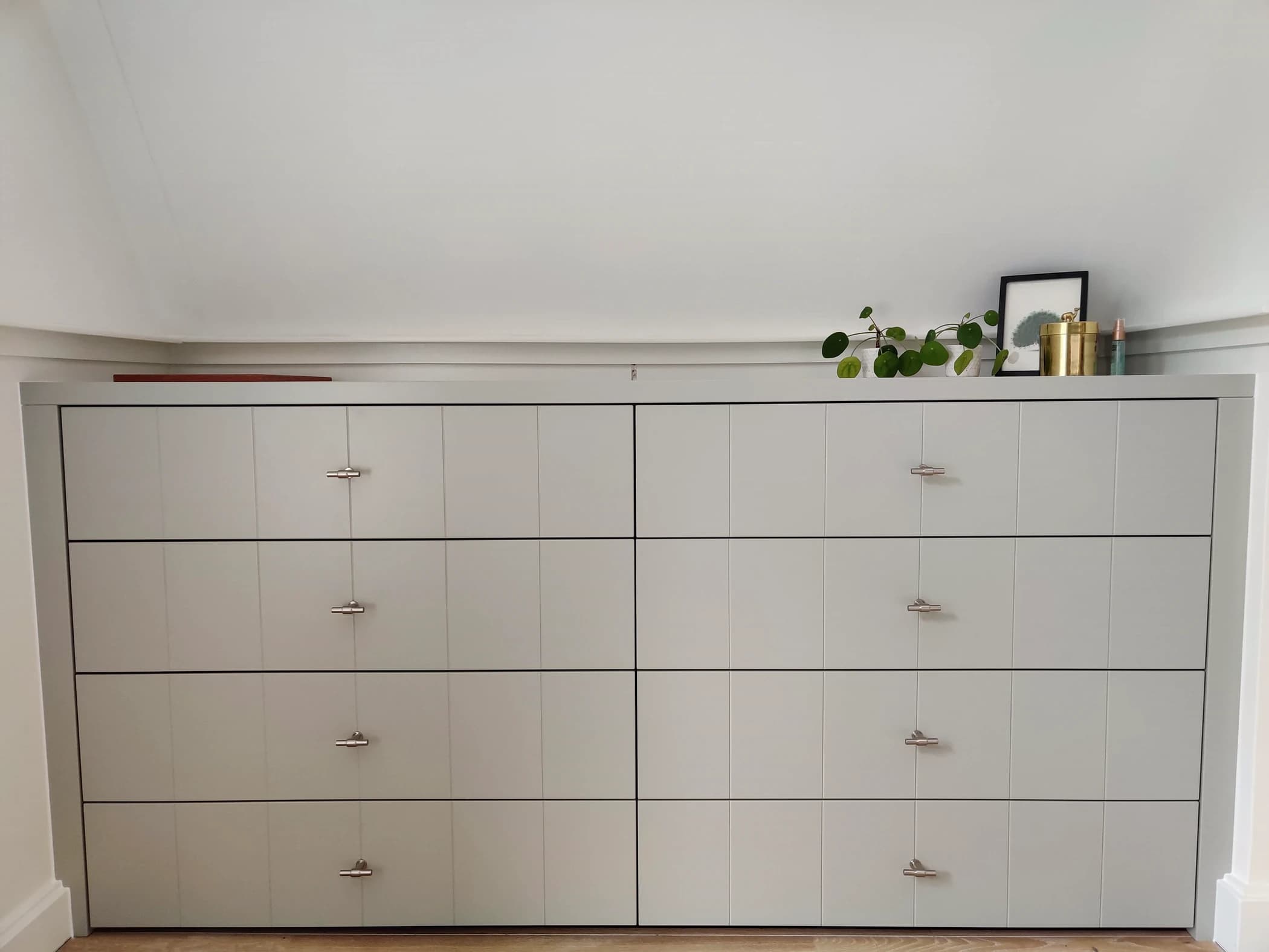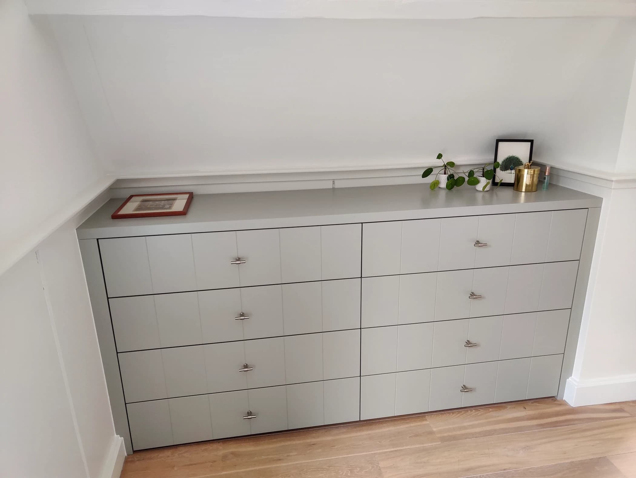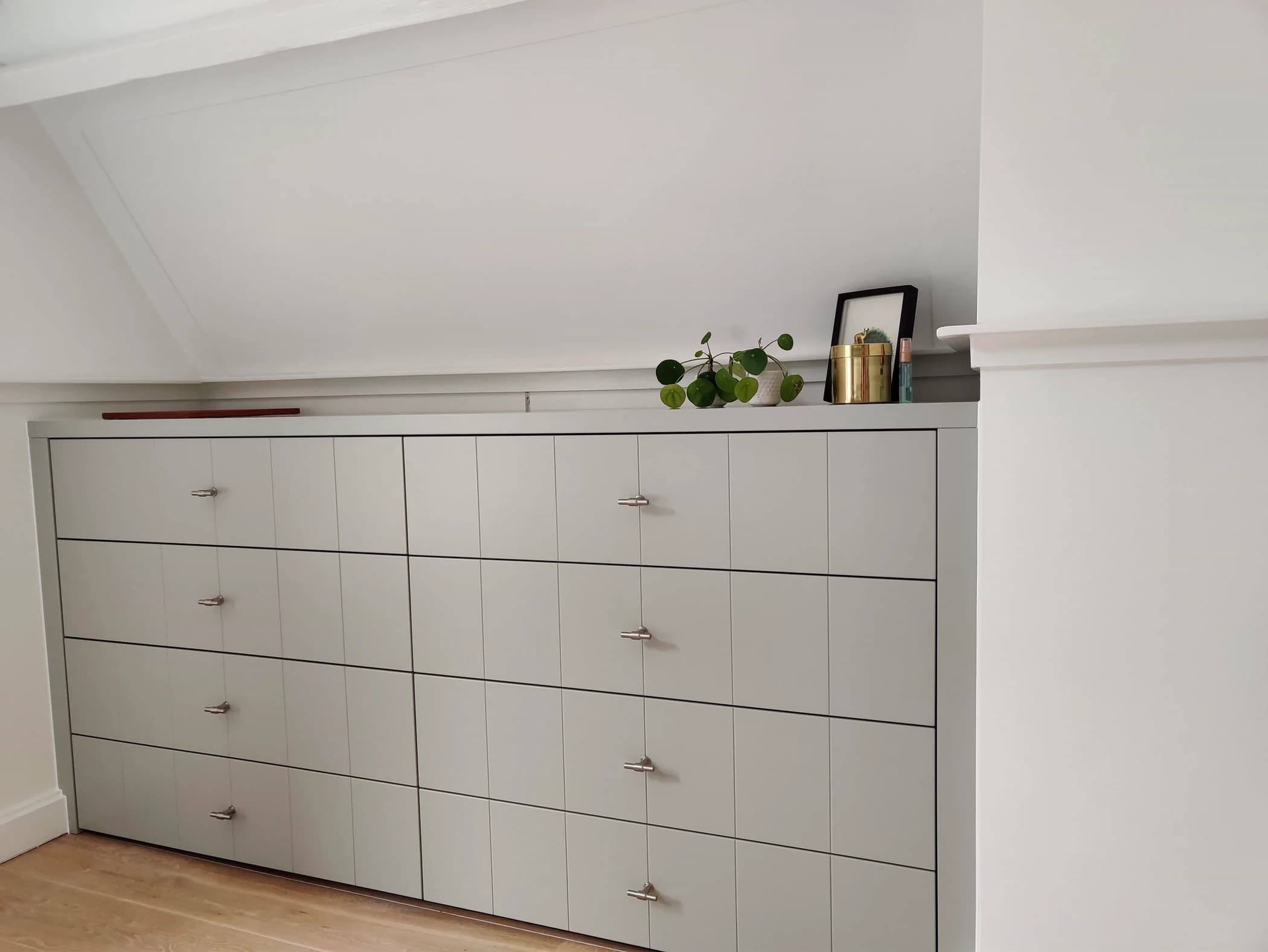 In dit project stond de wens van de klant centraal: extra opbergruimte creëren zonder concessies te doen aan het design. Het op maat gemaakte dressoir is voorzien van ruime lades die voldoende plek bieden voor kleding, beddengoed en andere spullen. Dankzij het maatwerk benut dit dressoir iedere centimeter van de ruimte optimaal, zelfs in een slaapkamer met schuine wanden. De doorlopende nerf geeft het meubel een subtiele, elegante uitstraling en zorgt voor een hoogwaardige afwerking.
