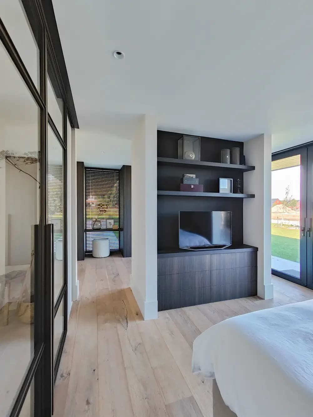 Deze roomdivider kast met tv-nis combineert functionaliteit en design. De nis biedt ruimte voor een televisie en decoratieve elementen, terwijl de gesloten lades zorgen voor een opgeruimd geheel. Dankzij het slimme ontwerp blijft de slaapkamer ruimtelijk ogen, terwijl de kast een duidelijke scheiding vormt tussen het slaapgedeelte en de rest van de ruimte.