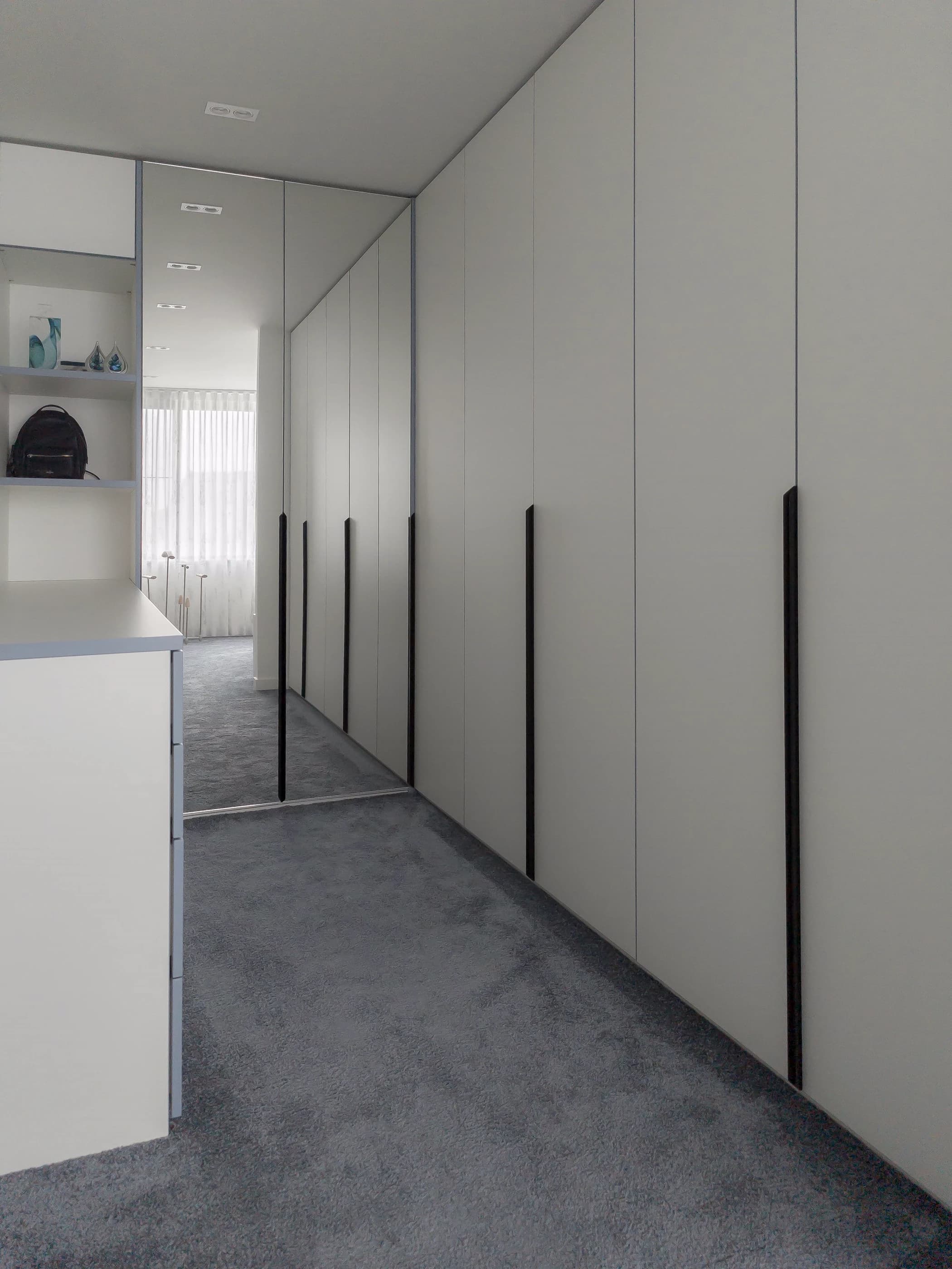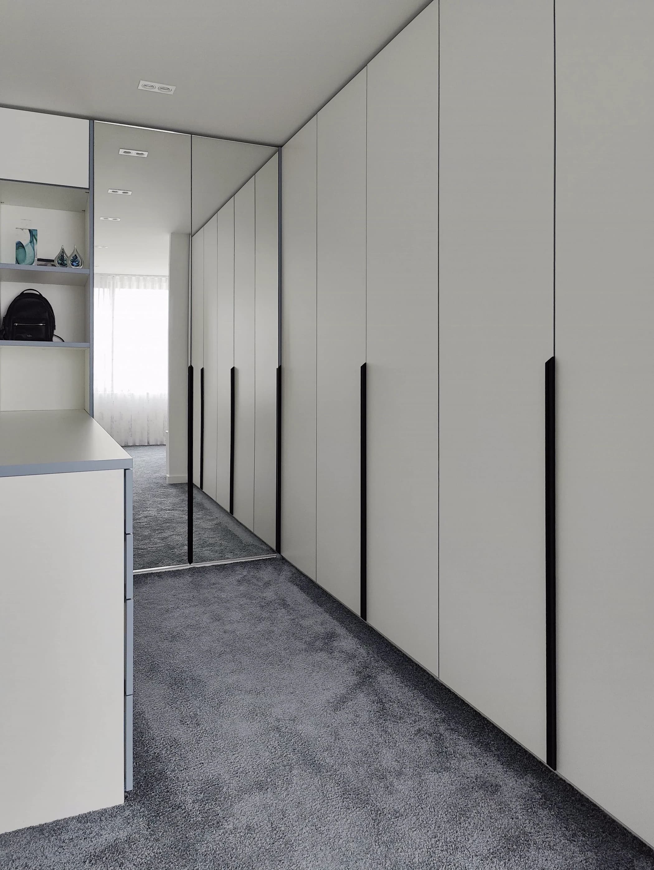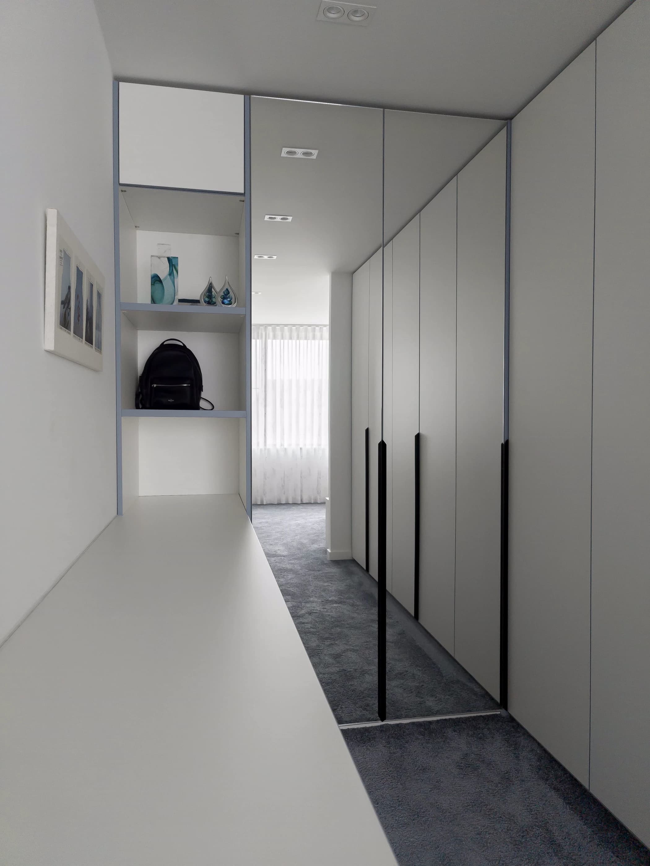De kastenwand is voorzien van een grote spiegel, wat niet alleen praktisch is, maar ook een ruimtelijk effect creëert in de kamer. De spiegel zorgt voor een open gevoel en maakt de ruimte optisch groter, wat ideaal is voor zowel slaapkamers als kleedkamers. Het spiegeloppervlak is geïntegreerd in de kastenwand, wat bijdraagt aan het uniforme en strakke ontwerp.