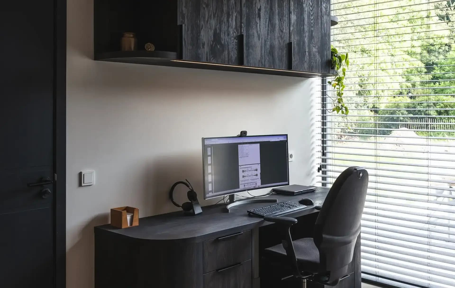 Een bureaukast op maat biedt de perfecte balans tussen stijl en functionaliteit. In dit ontwerp is er voldoende ruimte gecreëerd voor documenten, boeken en accessoires, zonder dat de rust in de ruimte verloren gaat. De op maat gemaakte kast sluit naadloos aan op het bureau, waardoor er één samenhangend geheel ontstaat dat overzicht en comfort biedt.