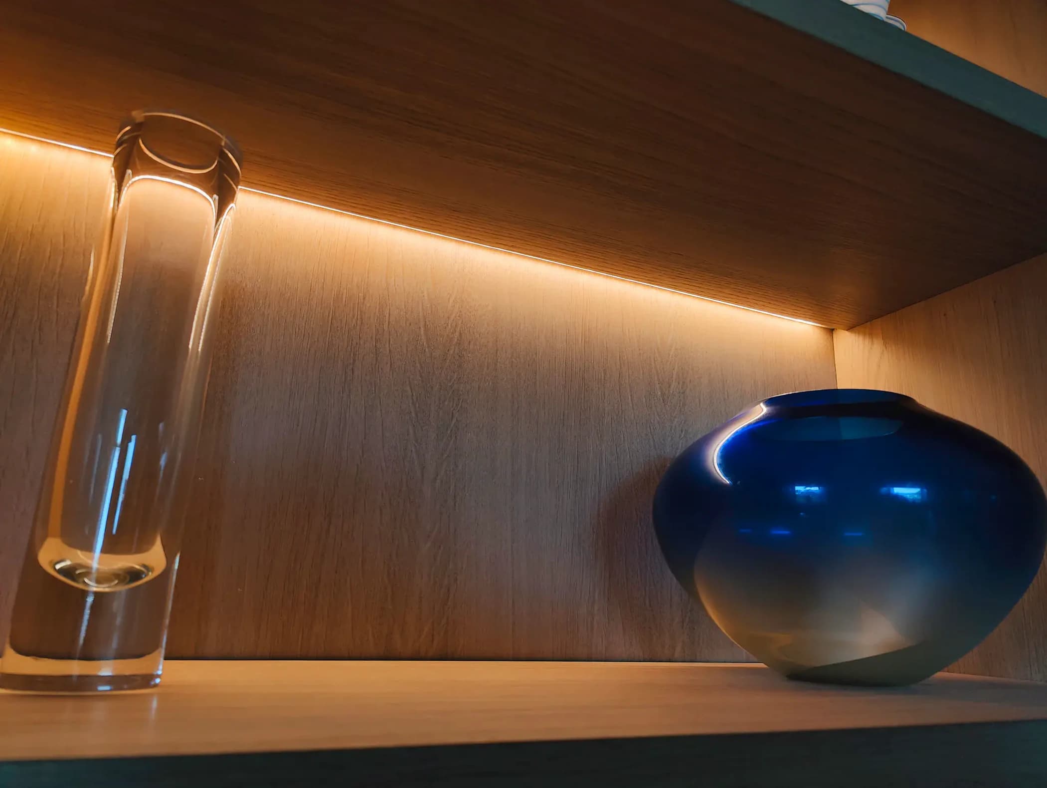 Deze op maat gemaakte buffetkast in Zeist combineert modern design met een vleugje chic. De kast is afgewerkt met een zwarte houtlook decorplaat en heeft stijlvolle glazen deuren, waardoor het een elegant pronkstuk is voor elke woonkamer. Wat deze buffetkast extra bijzonder maakt, zijn de subtiele ledstrips die in de legplanken zijn verwerkt. Deze ledverlichting benadrukt de inhoud van de kast en creëert een warme, uitnodigende sfeer. De kast biedt niet alleen een stijlvolle opbergoplossing, maar is ook een eyecatcher in het interieur. Ideaal voor wie op zoek is naar een combinatie van functionaliteit en esthetiek.
